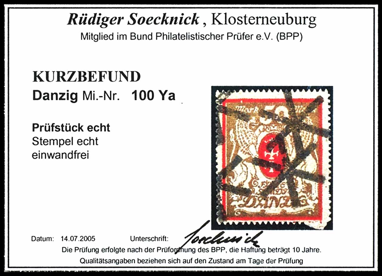 50 Mark "Großes Staatswappen", liegendes Wz. 2, zeitgerecht entwertet mit Sicherungsstempeln vom Postamt Danzig 1, tadellos durchstochen, Fotobefund Soecknick BPP: "echt und einwandfrei", Mi. 300.-