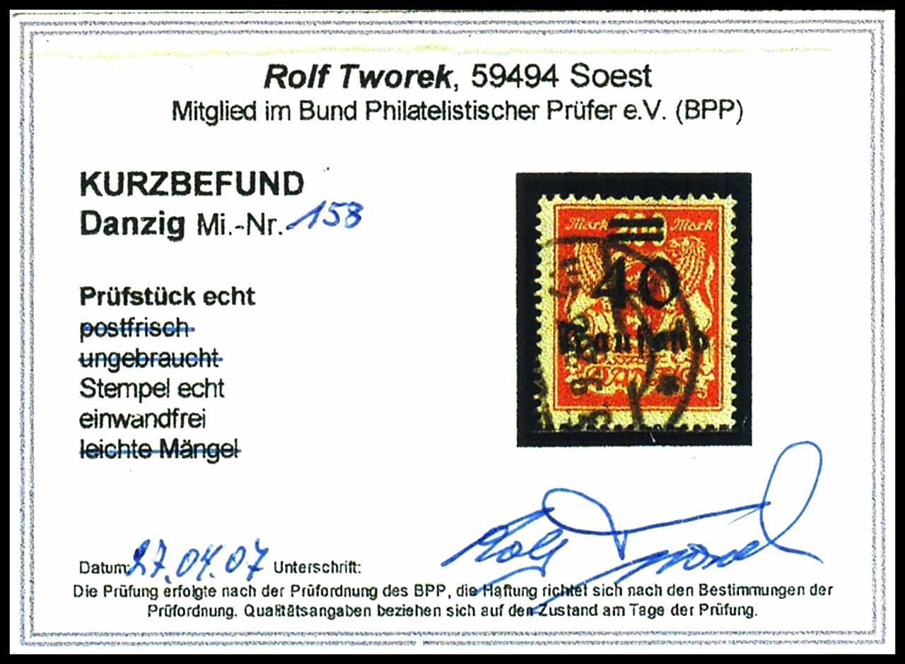40 Tausend auf 200 Mark Wappen, zeitgerecht gestempelt "DANZIG * 1 c 3.9.23 3-4N", tadellose Erhaltung, echt gestempelt nicht häufig, Fotobefund Rolf Tworek BPP (2007) "Stempel echt, einwandfrei", Mi. 280.-
