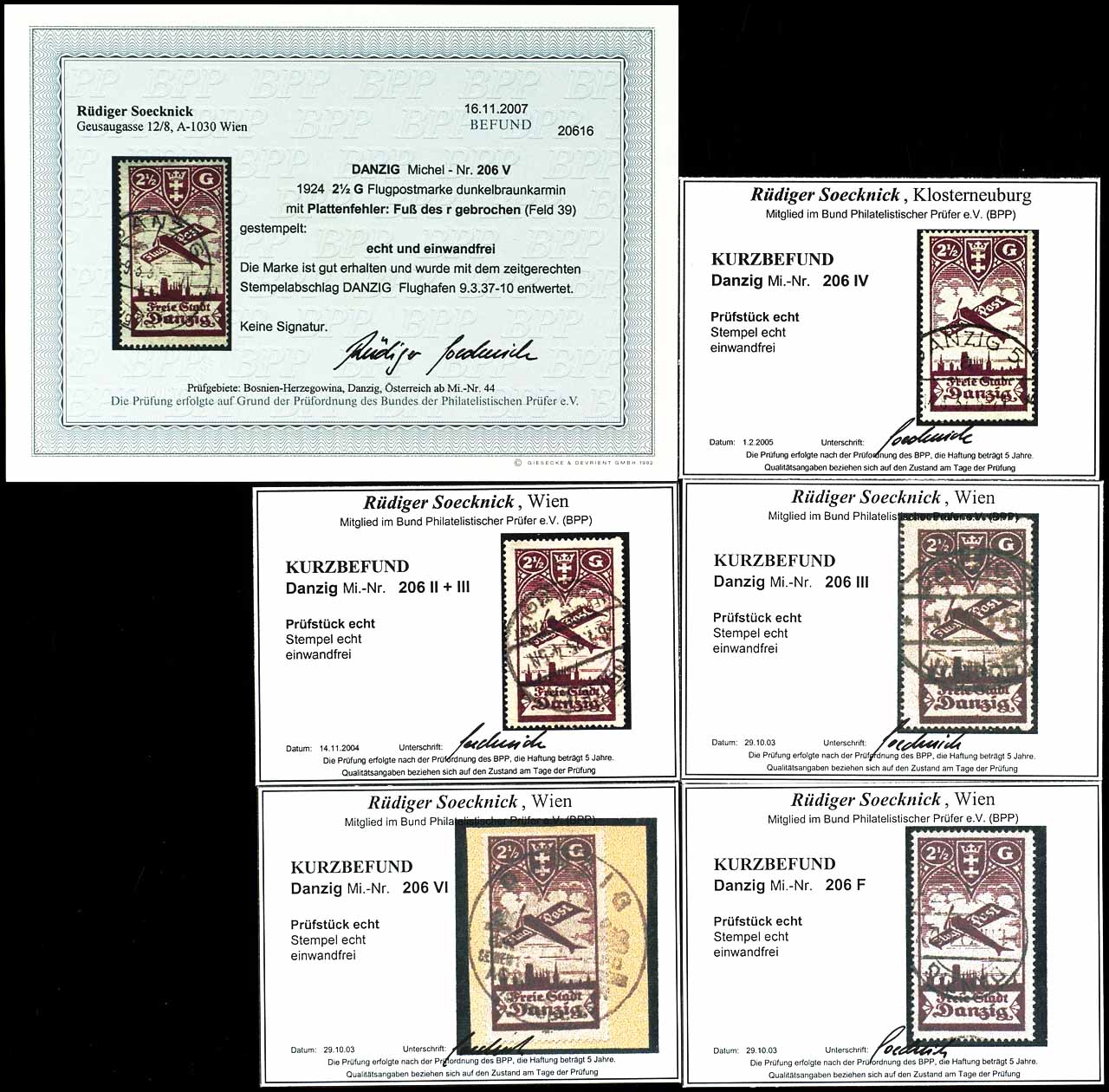 Lot 2 1/2 Gulden Flugpost (VI) 1924, mit den Plattenfehlern II-VI und der MiNr. 206F (ohne Unterdruck), jeweils in gestempelter Erhaltung und jede Einzelmarke mit Befund/Kurzbefund versehen von Rüdiger Soecknick (2003-2007),alle einwandfrei erhalten, Mi. 1400.-+