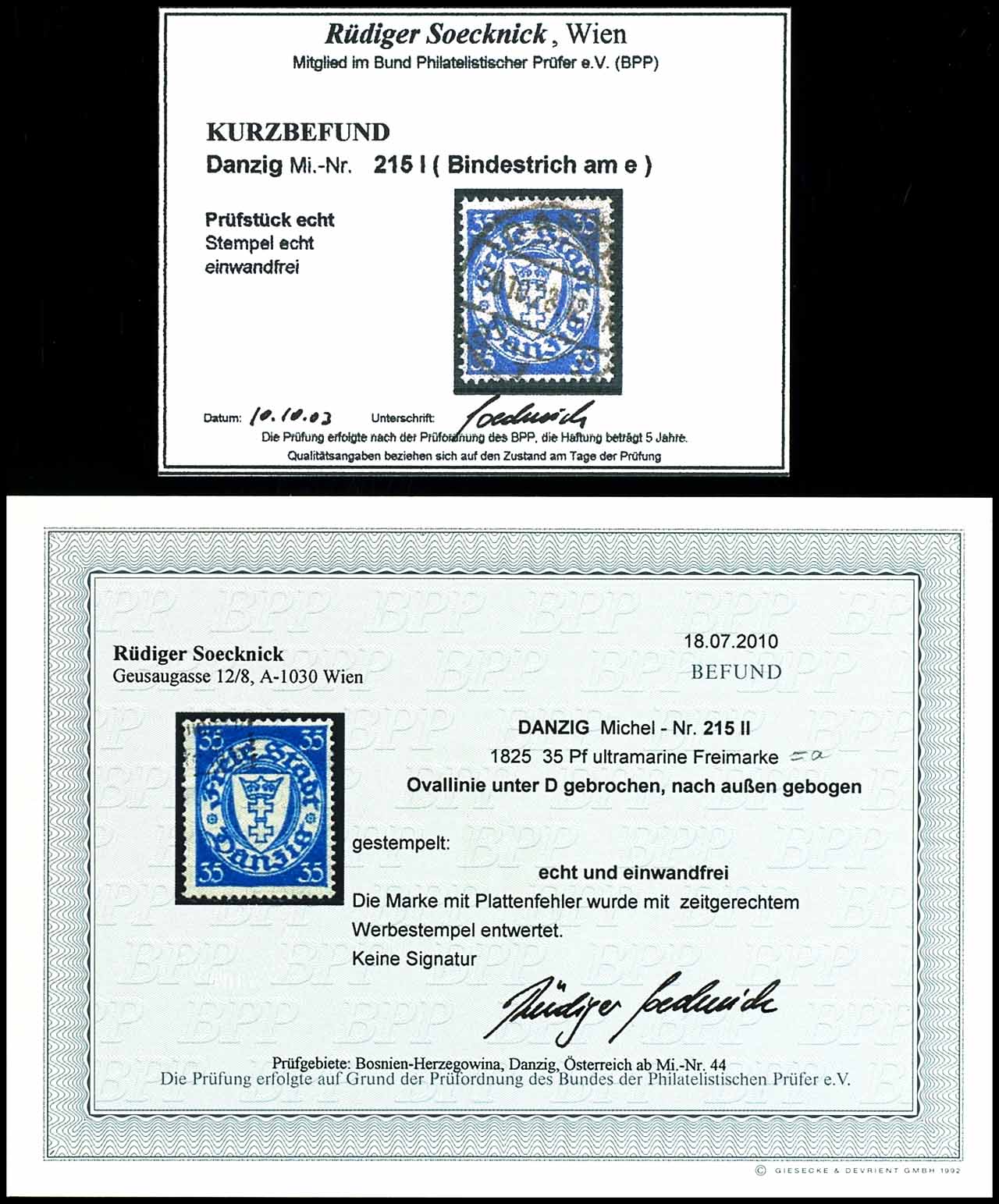 2 Marken mit 35 Pfennig Staatswappen einmal mit Plattenfehler I: "Bindestrich am zweiten e von Freie", gestempelt, einwandfrei, geprüft Soecknick BPP, Kurzbefund Rüdiger Soecknick (2003), sowie weitere Marke mit Plattenfehler II: "Ovallinie unter D gebrochen, nach außen verbogen", mit Werbestempel zeitgerecht entwertet, unsigniert, befund Rüdiger Soecknick BPP (2010), "echt und einwandfrei", Mi. 420.-, der Plattenfehler II recht selten im Angebot