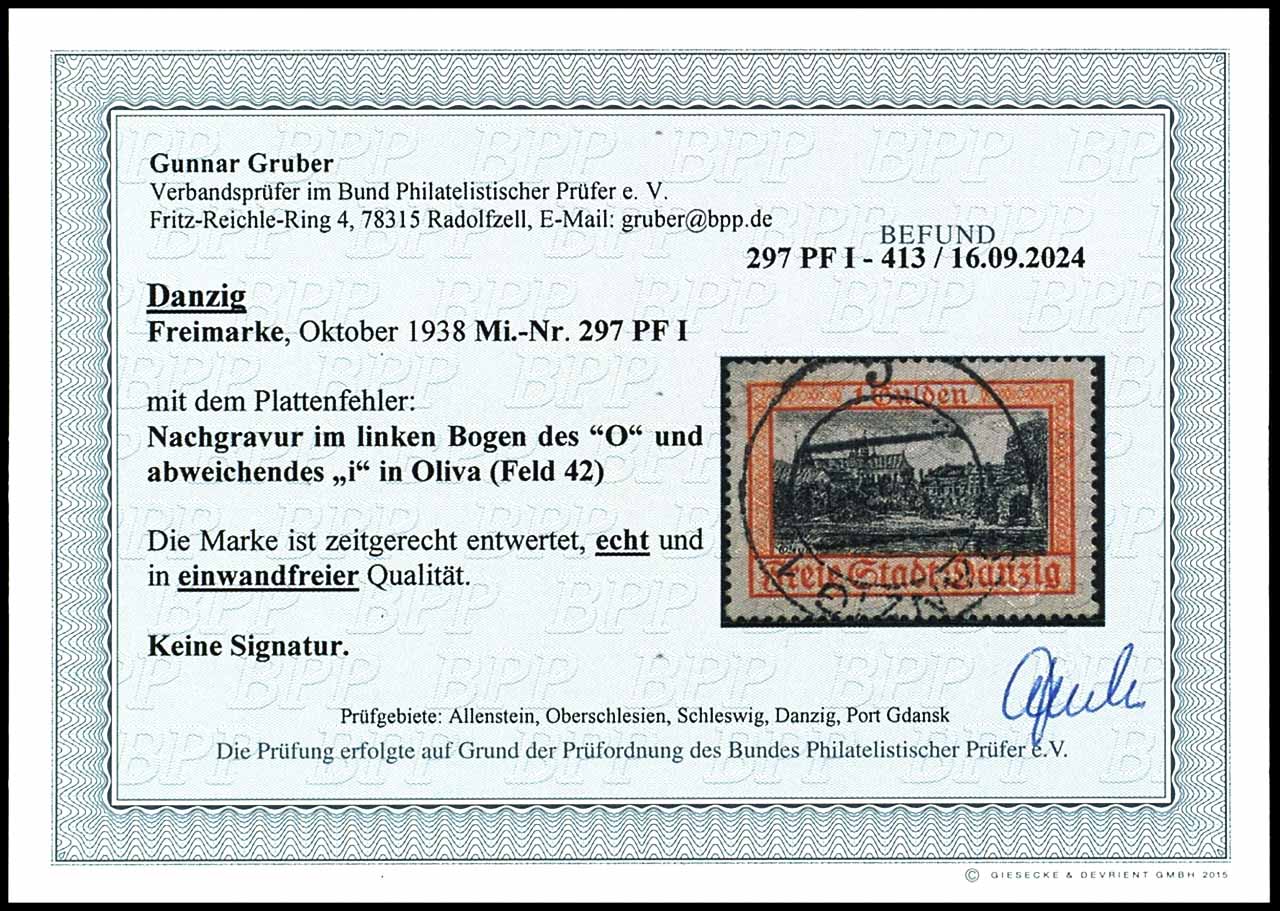1 Gulden Stadtansicht, Abart "Nachgravur im linken Bogen des O und abweichendes i in Oliva" (Feld 42), tadellos gestempelt auf Briefstück, Fotobefund Gruber BPP: "in einwandfreier Qualität.", Mi. -.-