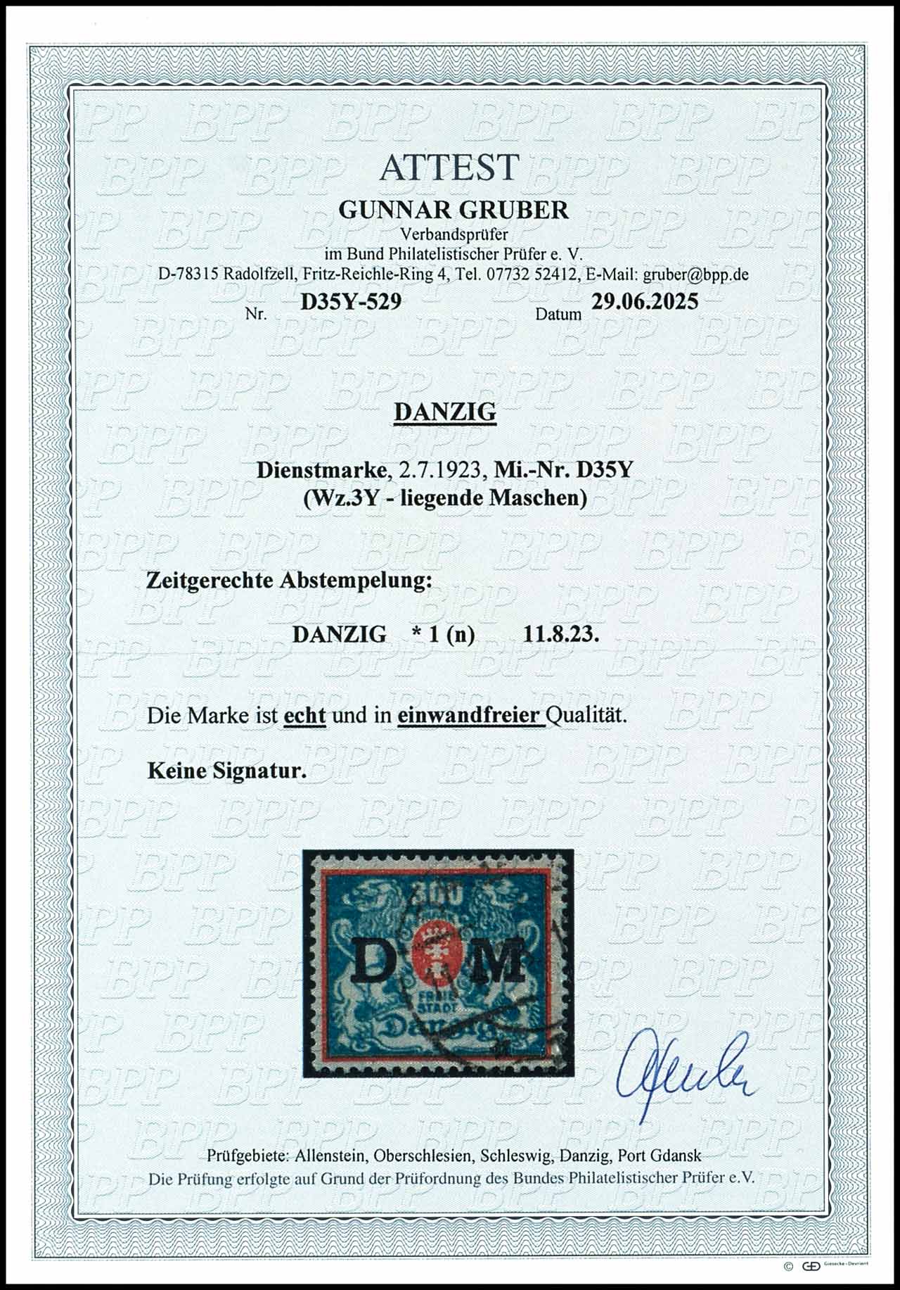 300 Mark Staatswappen mit schwarzem Bdr.-Aufdruck "D M", Wasserzeichen 3 Y, zeitgerecht entwertet "DANZIG * 1 n...11.8.23....", tadellose Erhaltung, Fotoattest Gunnar Gruber BPP "echt und einwandfrei", Mi. 500.-