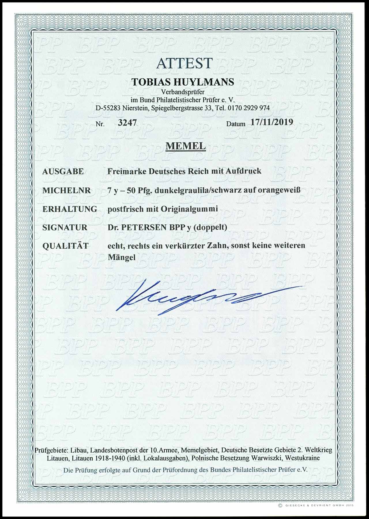50 Pfennig Germania mit Aufdruck "Memelgebiet", dunkelgraulila/schwarz auf orangeweiß, postfrisch, rechts ein verkürzter Zahn, ansonsten tadellos erhalten, geprüft Dr. Petersen BPP , Fotoattest Tobias Huylmans (2019), Mi. 500,--