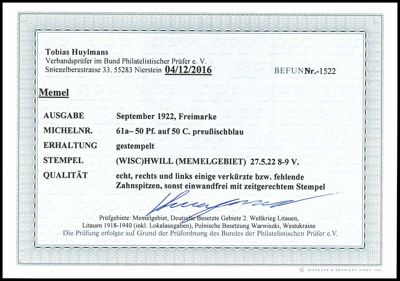 Memel Freimarken, mit schwarzem Aufdruck "MEMEL 50 Pfennig" auf 50 Centimes, preußischblau, gestempelt "(WISC)HWILL (MEMELGEBIET) 27.5.22 8-9V.", gut erhalten, nicht signiert, Befund Tobias Huylmans BPP (2018), "rechts und links einige verkürzte bzw. fehlende Zahnspitzen, sonst einwandfrei", Mi. 450,--