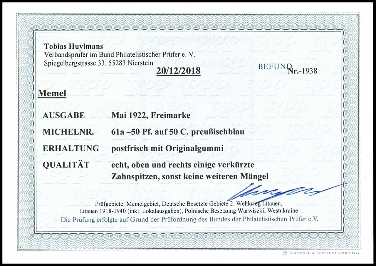Memel Freimarken, mit schwarzem Aufdruck "MEMEL 50 Pfennig" auf 50 Centimes, preußischblau, postfrisch, sehr gut erhalten, nicht signiert, Befund Tobias Huylmans BPP (2018), "oben und rechts einige verkürzte Zahnspitzen", Mi. 450,--
