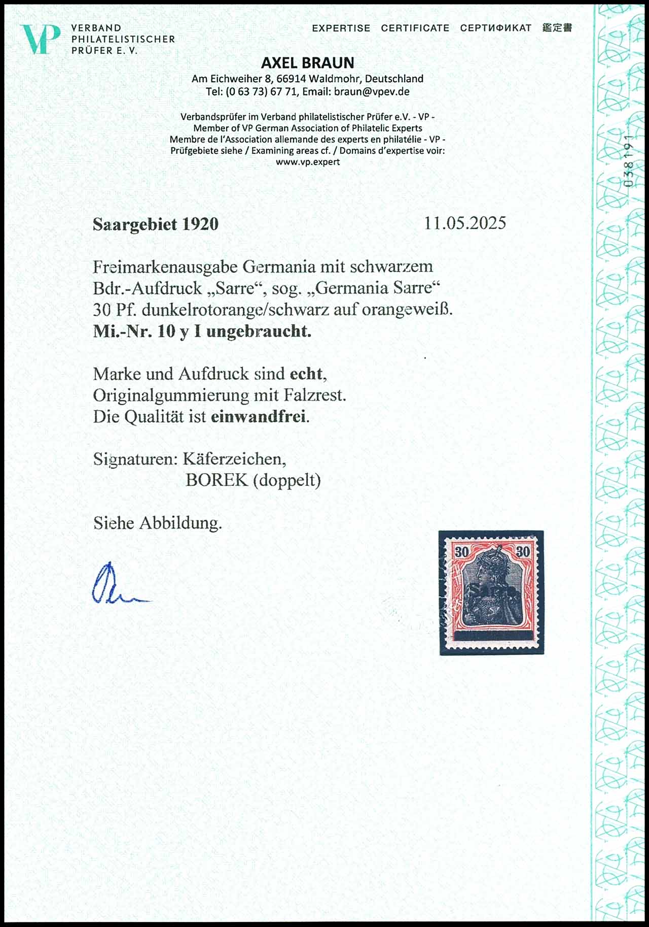 30 Pfennig Germania auf "y"-Paper, Aufdruck Type I, ungebraucht, signiert, Expertise Axel Braun VP (2025), Mi. 280.-