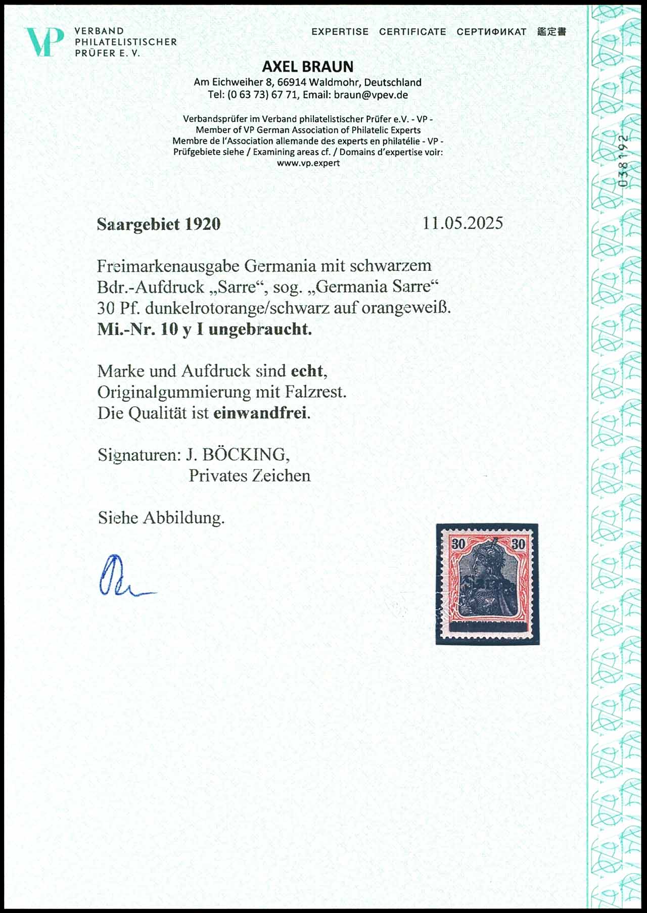 30 Pfg Germania auf orangeweißem Papier mit Aufdruck "Sarre" in Type I, ungebraucht, tadellose Erhaltung, Fotoattest Axel Braun BPP (2025) "Die Qualität ist einwandfrei.", Mi. 280.-