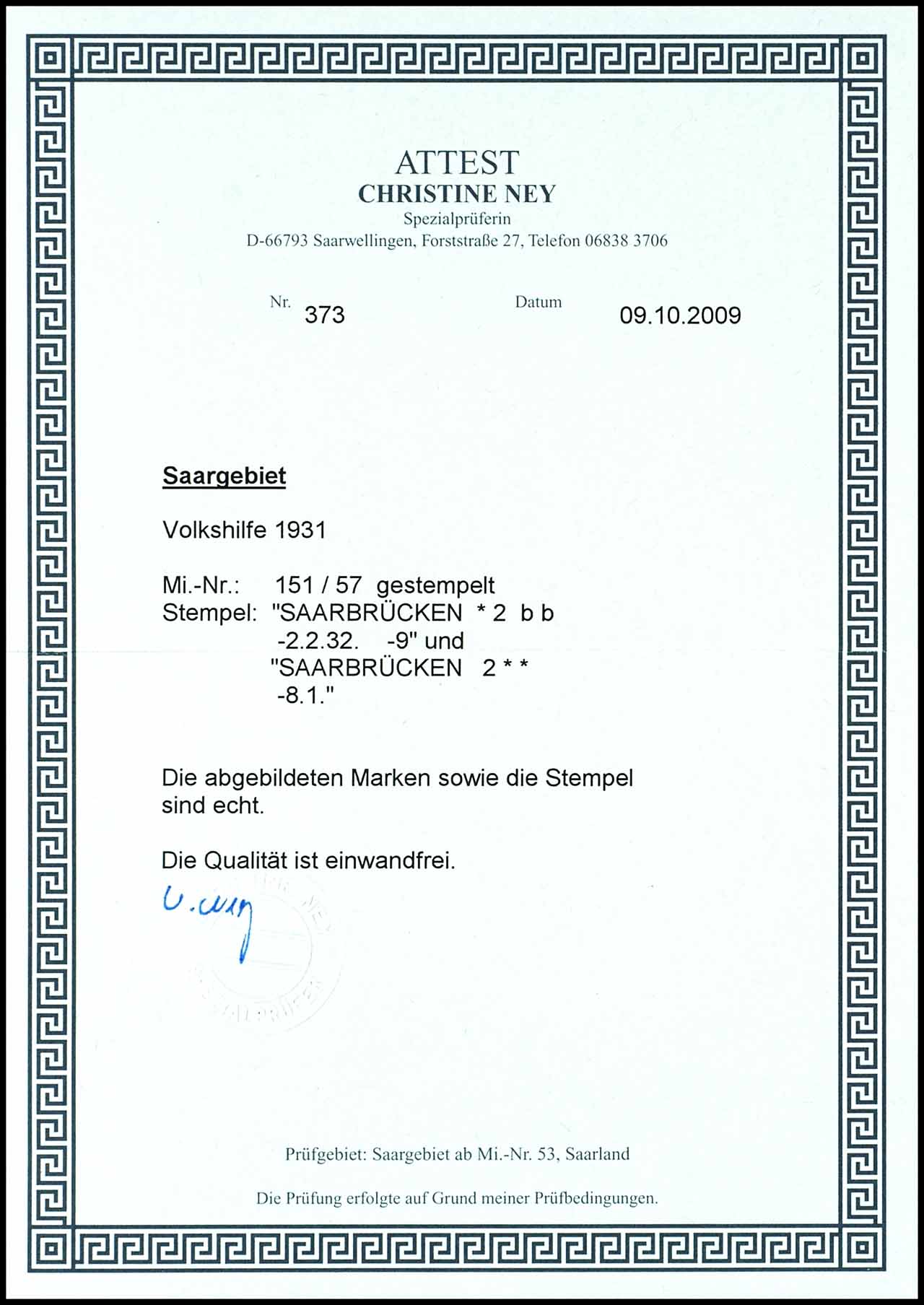 40 Cent bis 5 Francs Volkshilfe 1931, kompletter Satz mit sieben Werten, gestempelt "SAARBRÜCKEN * 2 bb -2.2. 32 -9" und "SAARBRÜCKEN 2 * * -8.1.", tadellose Erhaltung, Fotoattest Ney (2009) "einwandfrei" , Mi. 800.-