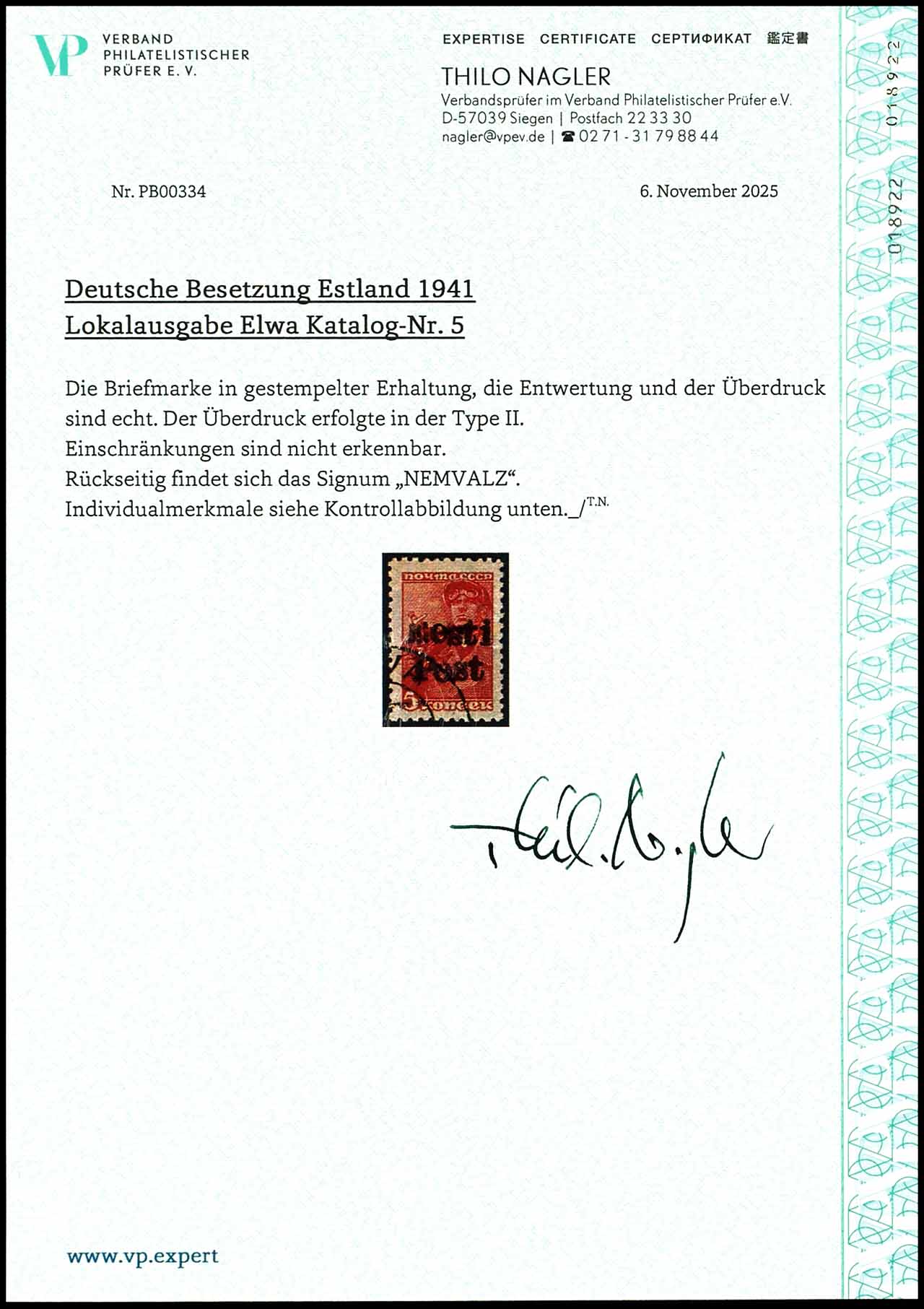 5 Kopeken dunkelbräunlichrot mit Handstempel-Aufdruck "Eesti Post", tadellos gestempelt, Auflage nur 600 Stück, Expertise Thilo Nagler VP (2025) "echt und einwandfrei", Mi. 220.-