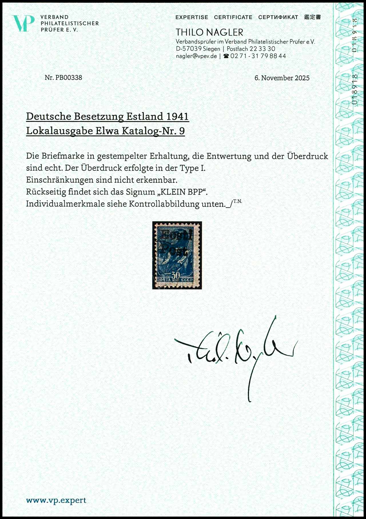 30 Kopeken Freimarke mit Handstempel-Aufdruck "Eesti Post", gestempelt, tadellose Erhaltung, Auflage nur 400 Exemplare, geprüft Klein BPP, Expertise Thilo Nagler VP (2025) "echt und einwandfrei", Mi. 220.-