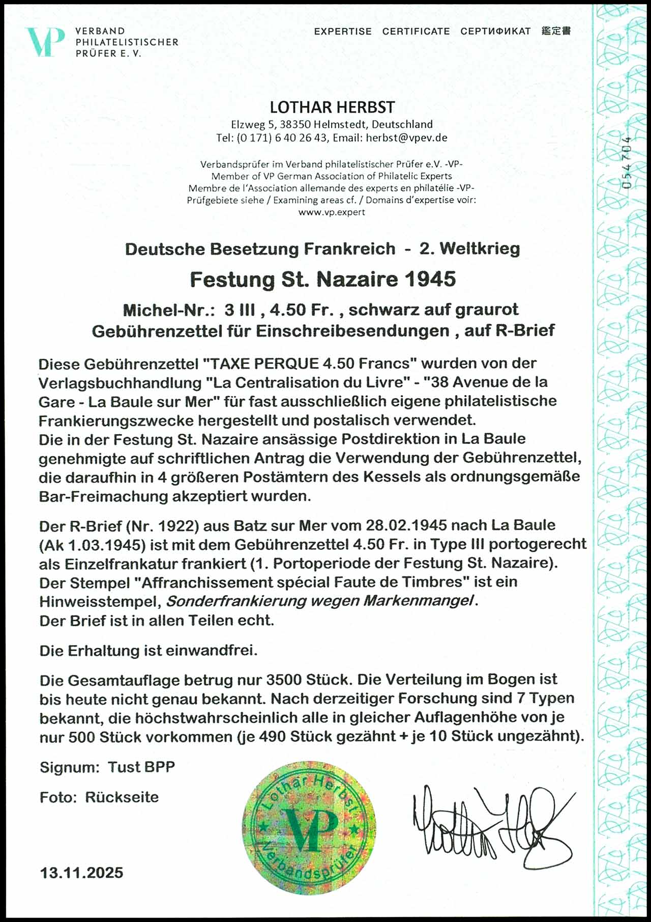 4,50 Fr. Einschreibgebührenzettel, Type III, Einzelfrankatur auf R-Brief von "Batz sur Mer 28 2 45" nach La Baule mit rückseitigem Ankunftsstempel vom 1.03.1945, Auflage je Type nur ca. 500 Exemplare, Expertise Lothar Herbst VP (2025) "Die Erhaltung ist einwandfrei."