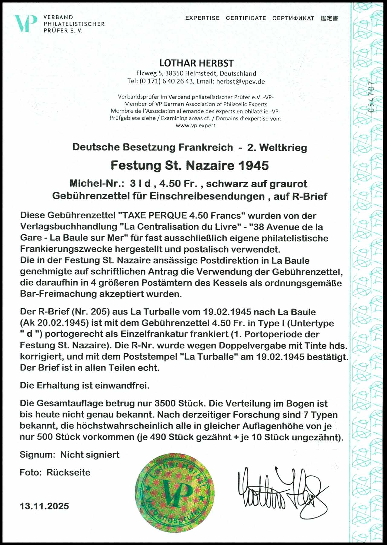 4,50 Fr. Einschreibgebührenzettel, Type Id, Einzelfrankatur auf R-Brief von "La Turballe 19 2 45" nach La Baule mit rückseitigem Ankunftsstempel vom 20.02.1945, Auflage je Type nur ca. 500 Exemplare, Expertise Lothar Herbst VP (2025) "Die Erhaltung ist einwandfrei."