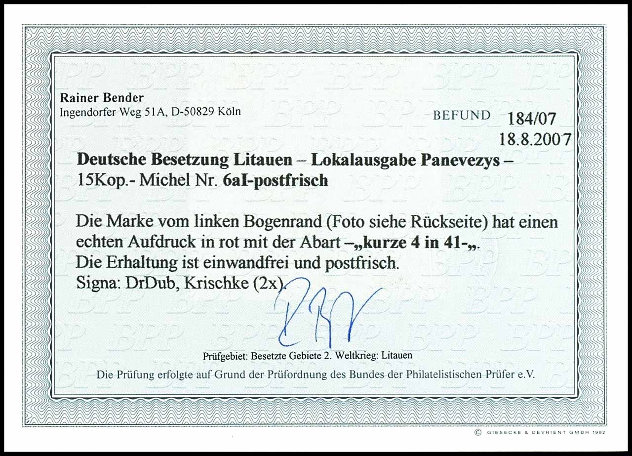 15 Kopeken Freimarke mit rotem Aufdruck und Abart "kurze 4 in 41", postfrisch, tadellose Erhaltung, geprüft Krischke u.a., Fotobefund Rainer Bender BPP (2007), "Die Erhaltung ist einwandfrei.", Mi. 150.-