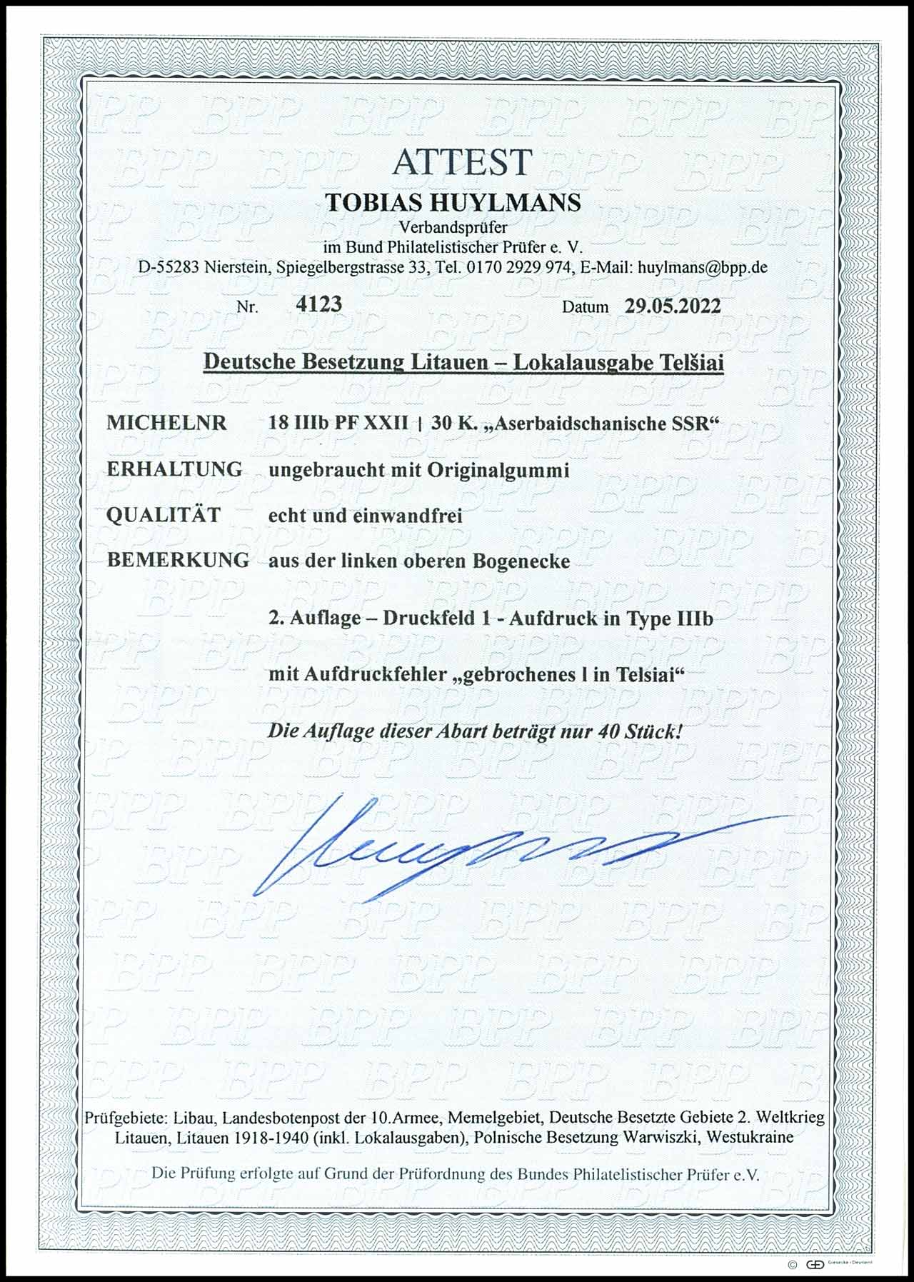 30 Kopeken Aserbaidschanische SSR, linkes oberes Eckrandstück, 2. Auflage - Druckfeld 1, Aufdruckfehler: "gebrochenes l in Telsiai", ungebraucht, tadellose Erhaltung, Fotoattest Tobias Huylmans BPP (2022) "einwandfrei", Mi. 720.- Auflage nur 40 Stück!