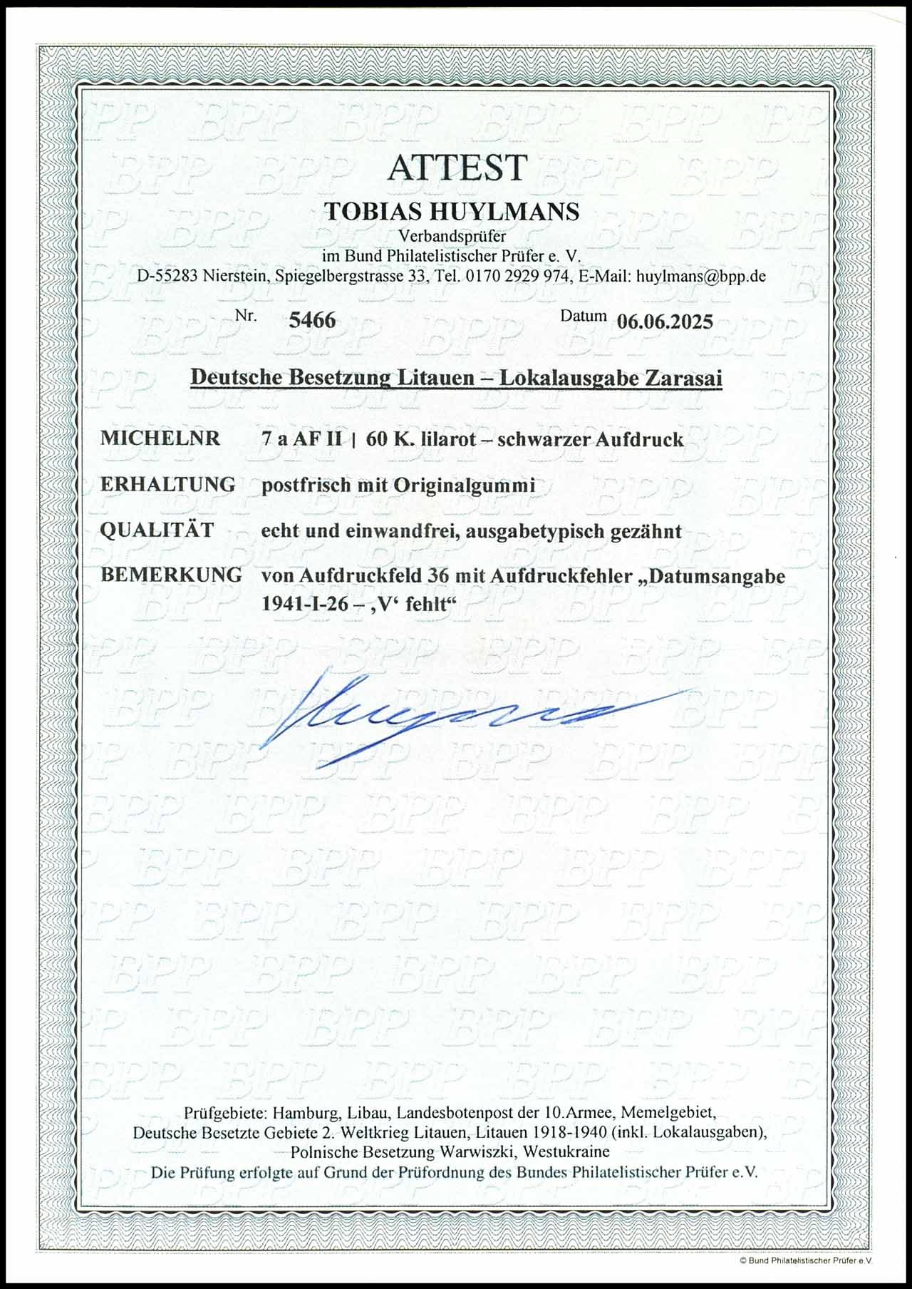 60 Kopeken, lilarot, von Aufdruckfeld 36 mit Aufdruckfehler "1941-I-26-, V fehlt", postfrisch, tadellose Erhaltung, Fotoattest Tobias Huylmans BPP (2025), "einwandfrei", Mi. 360.-