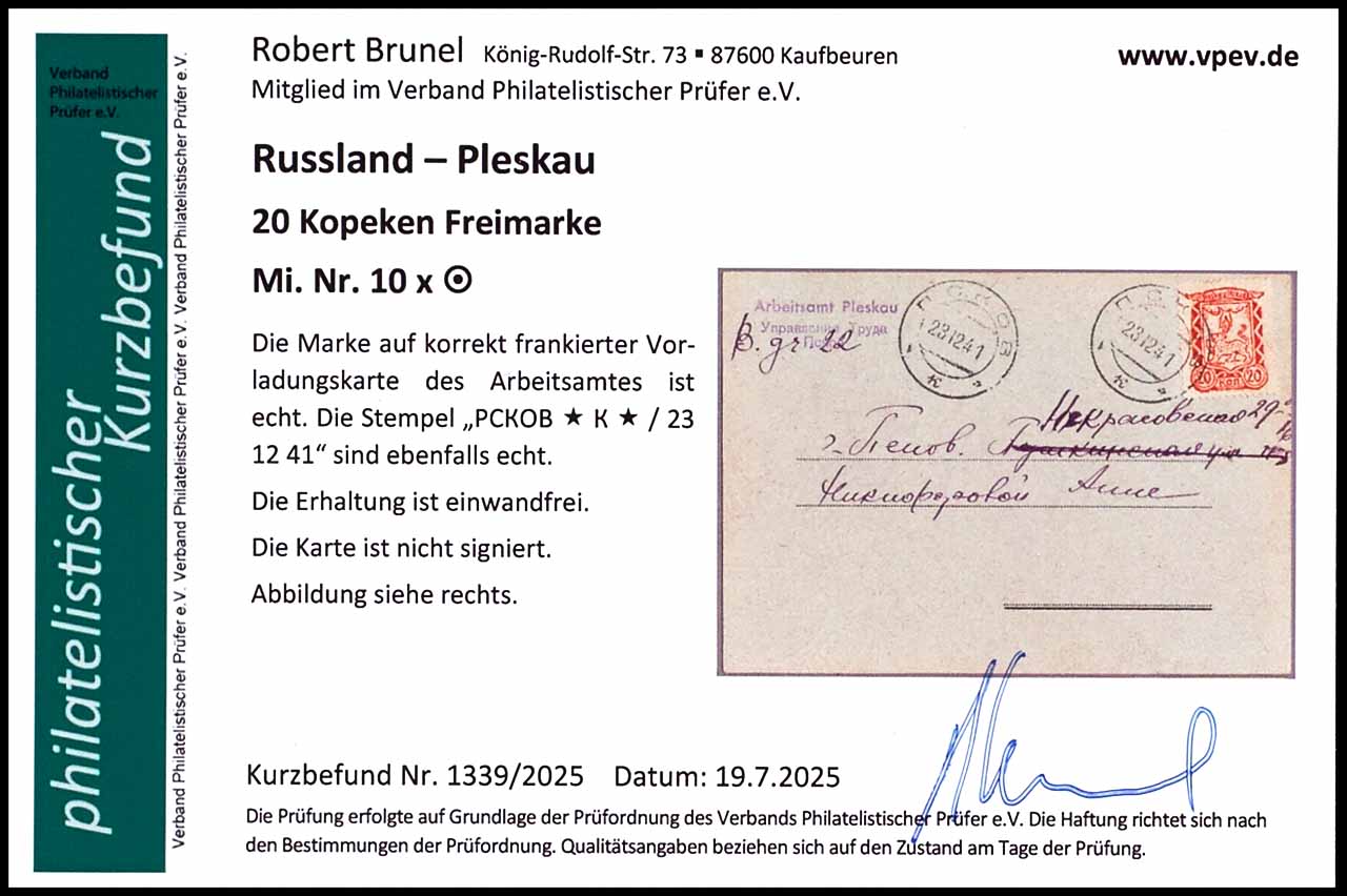 Pleskau, Freimarke zu 20 Kopeken, MiNr.10x, Einzelfrankatur auf korrekt frankierter Karte des Arbeitsamtes, entwertet mit Stempel "PCKOB * K * 23 12 41", tadellose Erhaltung, Fotobefund Robert Brunel VP (2025) "Die Erhaltung ist einwandfrei", nicht signiert