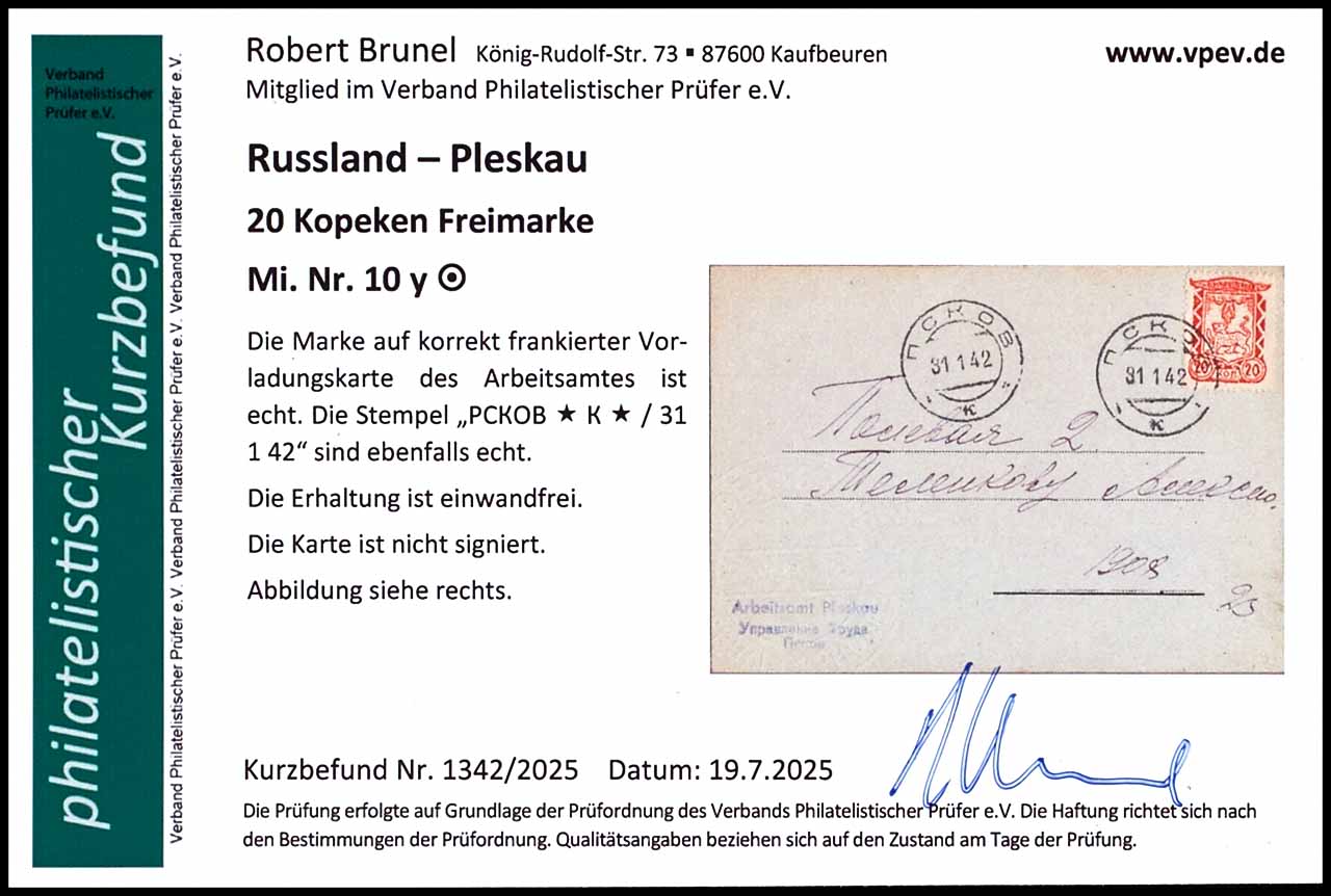 20 Kopeken, Einzelfrankatur auf korrekt frankierter Karte des Arbeitsamtes, entwertet mit Stempel "PCKOB * K * 31 1 42", tadellose Erhaltung, Fotobefund Robert Brunel VP (2025) "Die Erhaltung ist einwandfrei"
