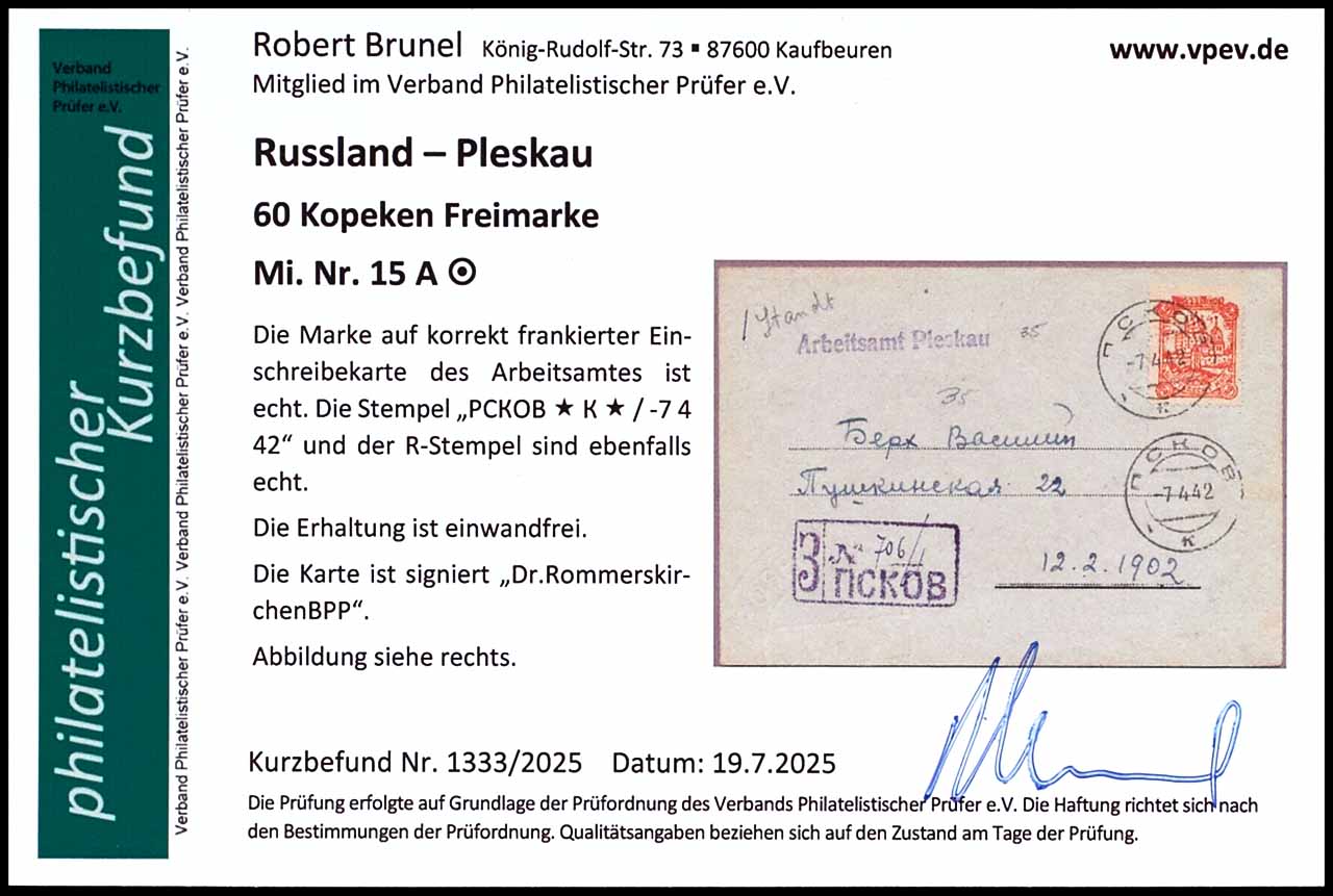 60 Kopeken, Einzelfrankatur auf korrekt frankierter Einschreibekarte des Arbeitsamtes, entwertet mit Stempel "PCKOB * K * -7 4 42", tadellose Erhaltung, geprüft Dr. Rommerskirchen BPP, Fotobefund Robert Brunel VP (2025) "Die Erhaltung ist einwandfrei"