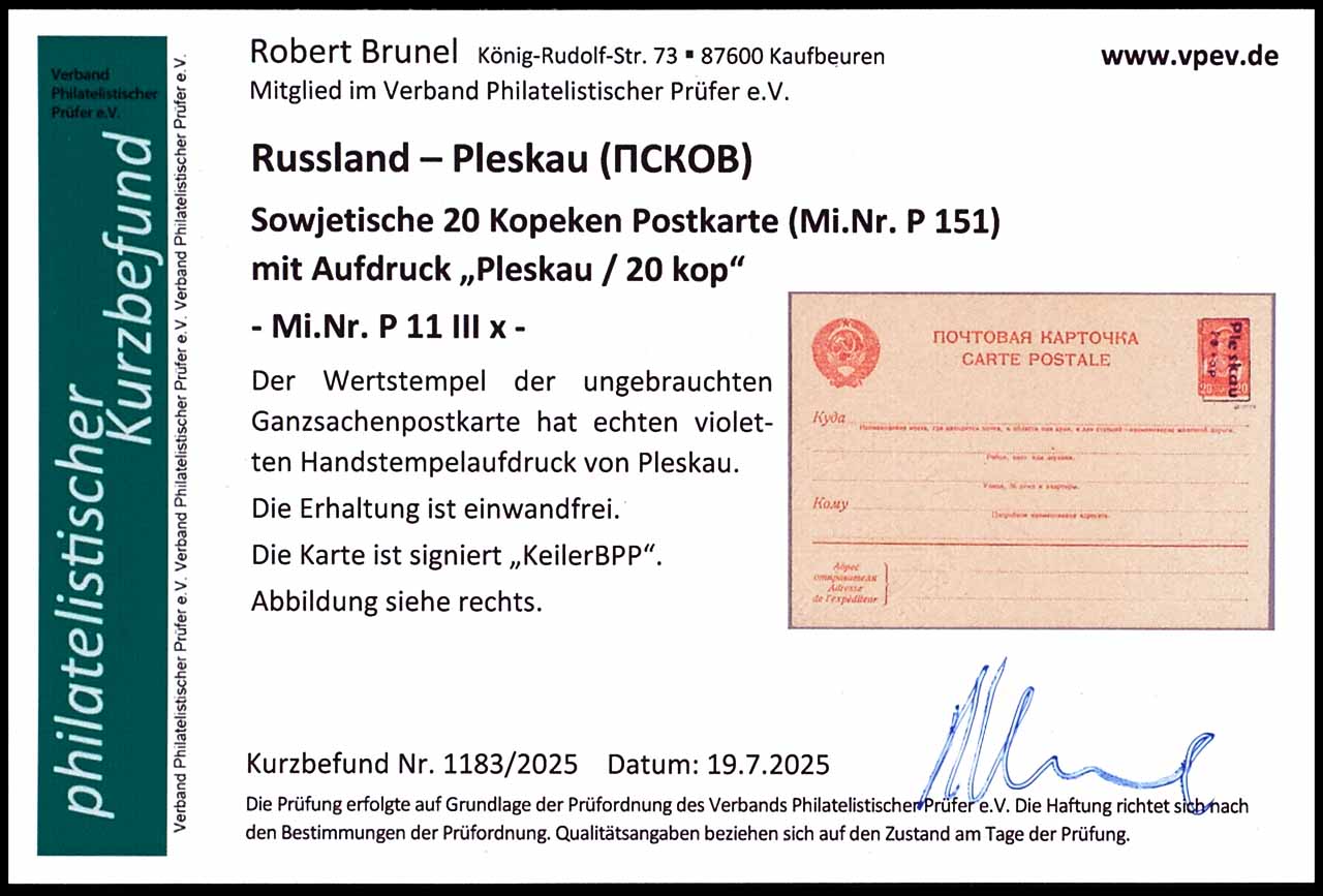 20 Kopeken Ganzsachenpostkarte mit Aufdruck " Pleskau/ 20 kop", violetter Handstempelaufdruck, ungebraucht, tadellose Erhaltung, geprüft Keiler BPP, Fotobefund Robert Brunel VP (2025), "Die Erhaltung ist einwandfrei"