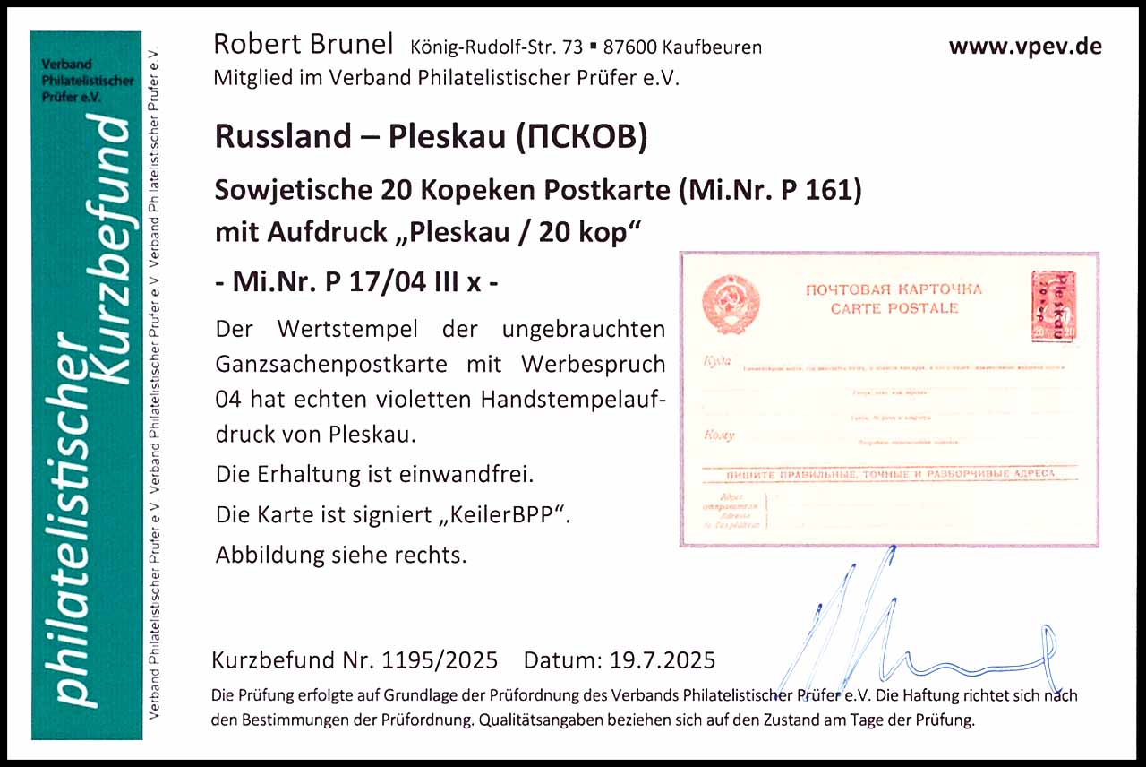 20 Kopeken Ganzsachenpostkarte mit Aufdruck "Pleskau/20 kop", mit Werbespruch 04, violetter Handstempelaufdruck, ungebraucht, tadellose Erhaltung, geprüft Keiler BPP, Fotobefund Robert Brunel VP (2025), "Die Erhaltung ist einwandfrei"