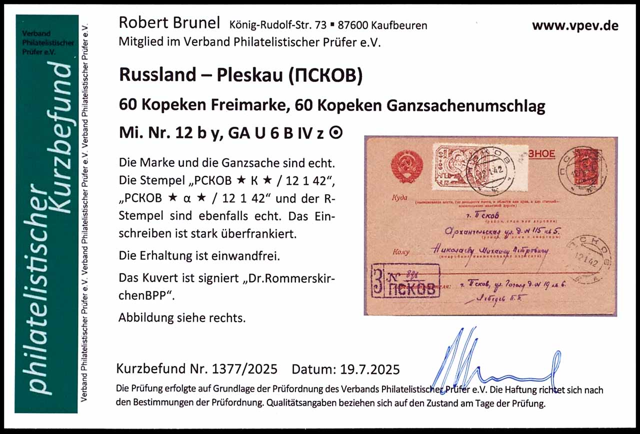 60 Kopeken eingeschriebener Ganzsachenumschlag mit Aufdruck "Pleskau/ 60 kop", schwarzer Handstempelaufdruck, mit Zusatzfrankatur Pleskau MiNr. 12by, entwertet mit Stempel "PCKOB * K * 12 1 42" und "PCKOB * a * 12 1 42", der eingeschriebene Ganzsachenumschlag ist überfrankiert, tadellose Erhaltung, geprüft Dr. Rommerskirchen BPP, Fotobefund Robert Brunel VP (2025) "Die Erhaltung ist einwandfrei"