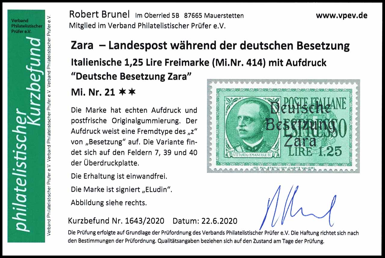 Zara-Landespost während der deutschen Besetzung, italienische Freimarke zu 1,25 Lire mit Aufdruck "Deutsche Besetzung Zara", Marke mit Aufdruckfehler XIV: "Fremdtype des z in Besetzung", Bogenfelder 7, 39 und 40 der Überdruckplatte, postfrische Erhaltung, geprüft ELudin, Fotobefund Robert Brunel VP (2020), "die Erhaltung ist einwandfrei", Mi. 120,--