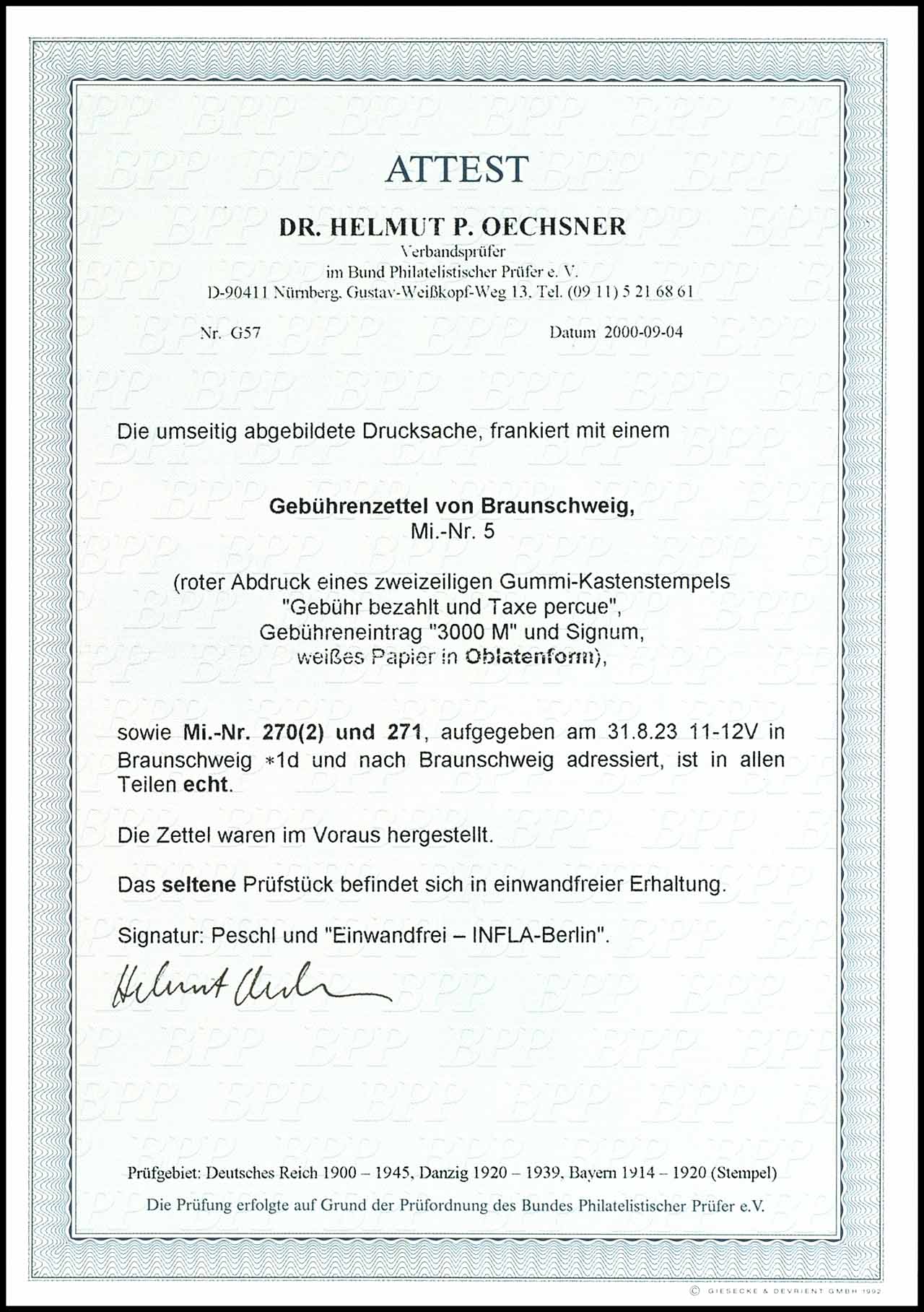 Braunschweig: 3000 Mark Gebührenzettel in Mischfrankatur mit 400 Mark und 2x 300 Mark Ziffern auf Ortsbrief aus BRAUNSCHWEIG 31.8.23, tadellose Erhaltung, geprüft Peschl, Fotoattest Dr. Oechsner BPP "Das seltene Prüfstück befindet sich in einwandfreier Qualität."