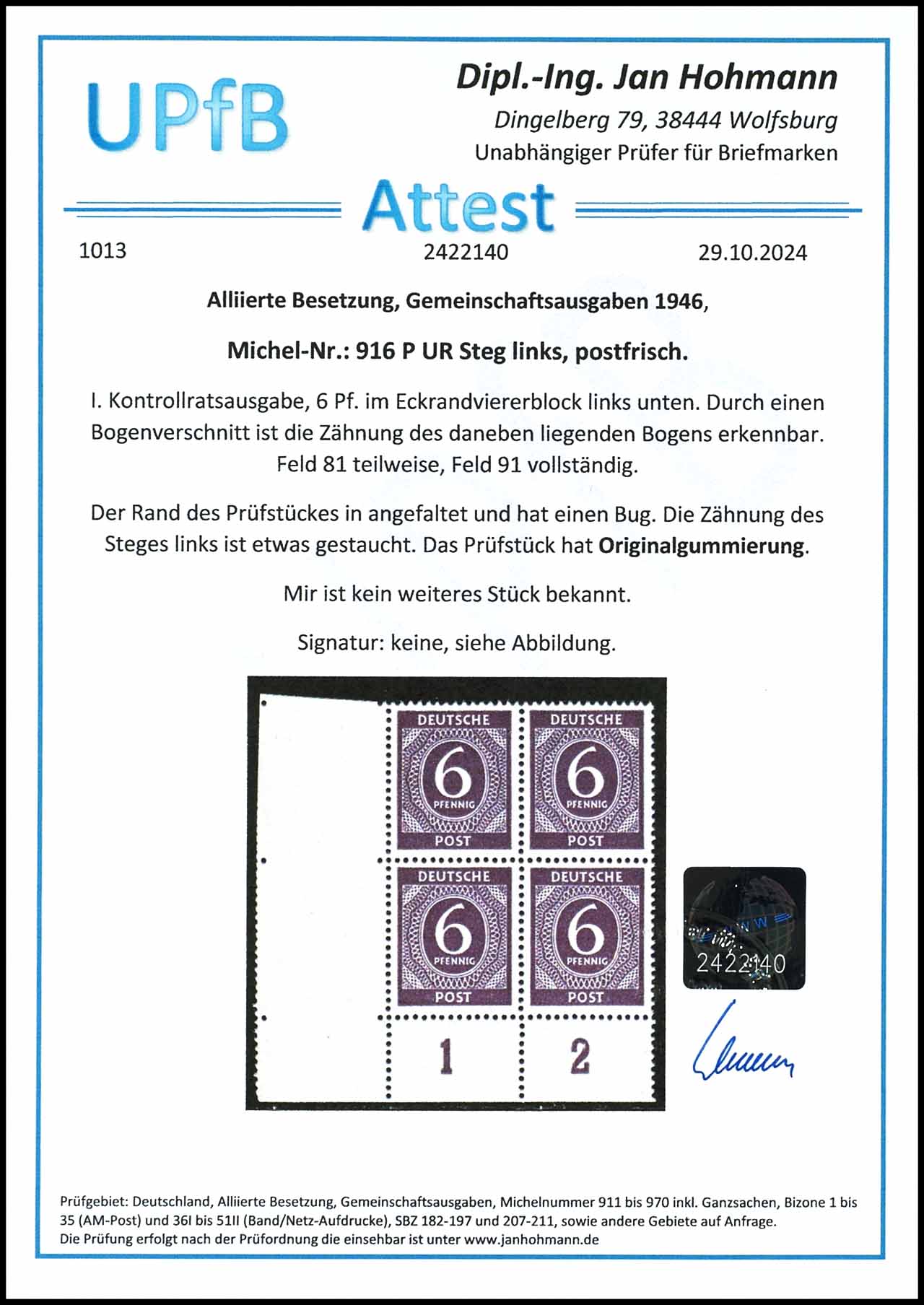 6 Pf. Ziffer, Eckrandviererblock links unten, postfrisch, Büge, durch Bogenverschnitt Zähnung des daneben liegenden Bogens erkennbar, Feld 81 teilweise, Feld 91 vollständig, nicht signiert, Attest Hohmann UPfB: "...kein weiteres Stück bekannt" im Michel nicht bewertet