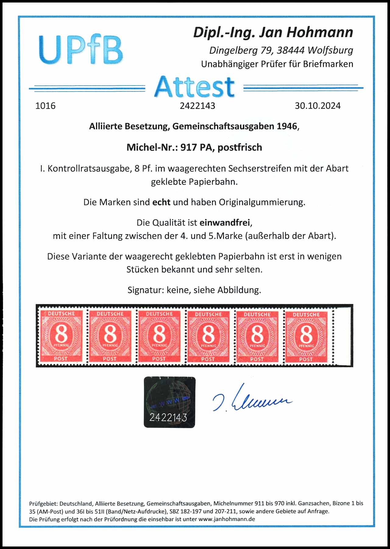 8 Pf Ziffer, einwandfrei, postfrisch, waagerechter Sechserstreifen mit der Abart geklebte Papier waagerecht über 3 Marken, sehr selten, nicht signiert, Attest Hohmann UPfB, Mi 1800.-