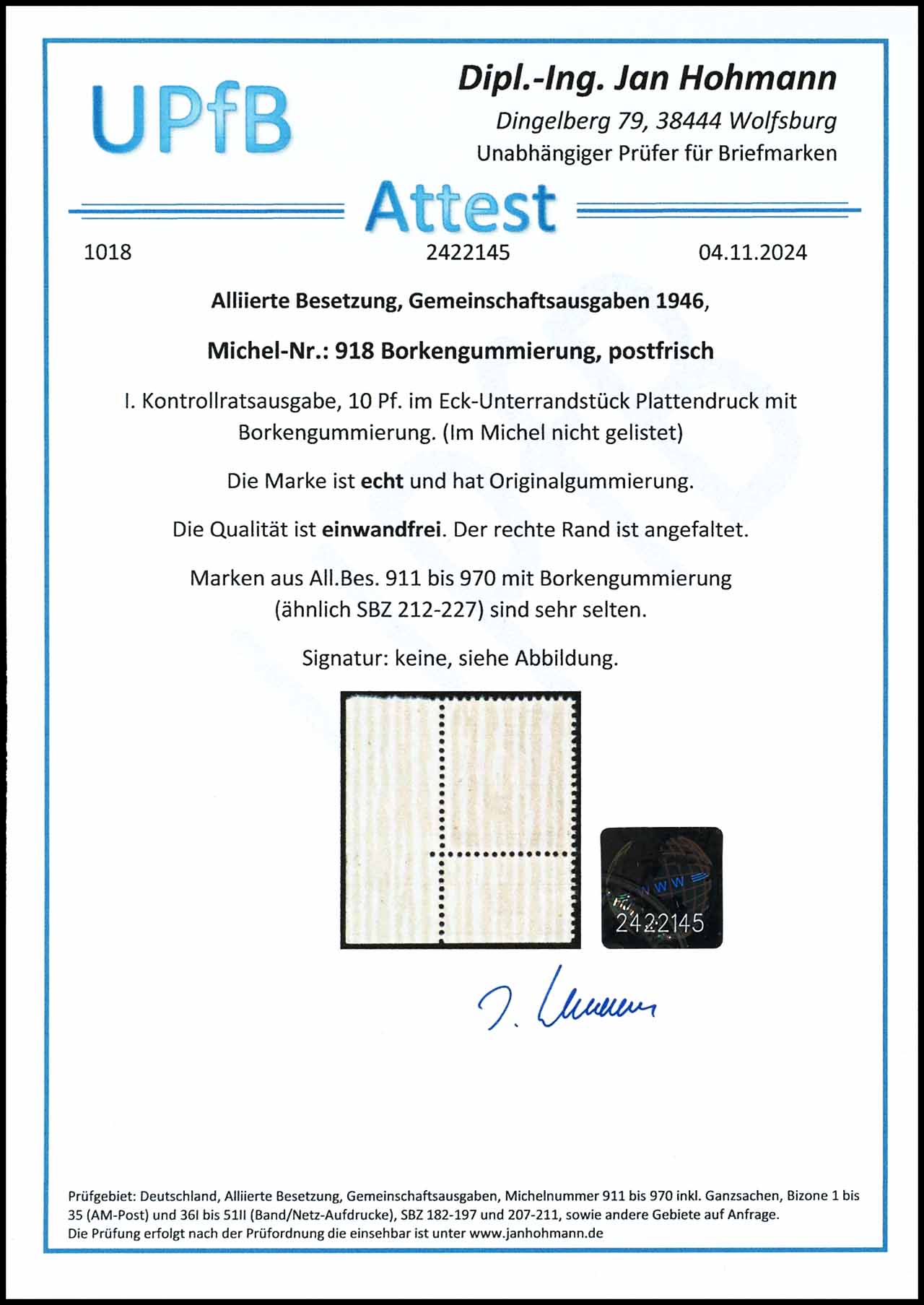 10 Pf Ziffer, Borkengummierung, einwandfrei, postfrisch, Attest Hohmann UPfB, im Michel nicht gelistet