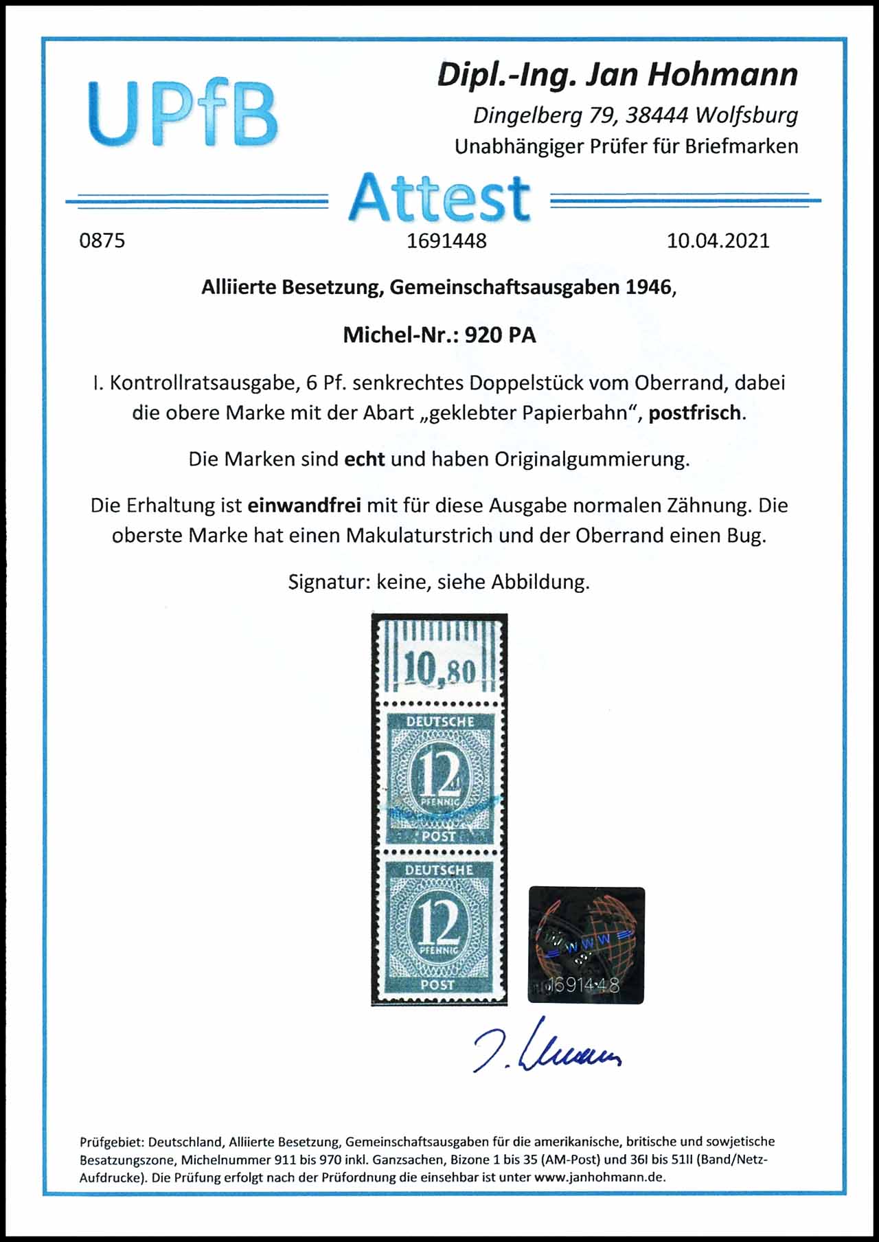 12 Pf Ziffer, einwandfrei, postfrisch, senkrechtes Oberrandpaar mit der Abart geklebte Papierbahn, Attest Hohmann UPfB, Mi 800.-