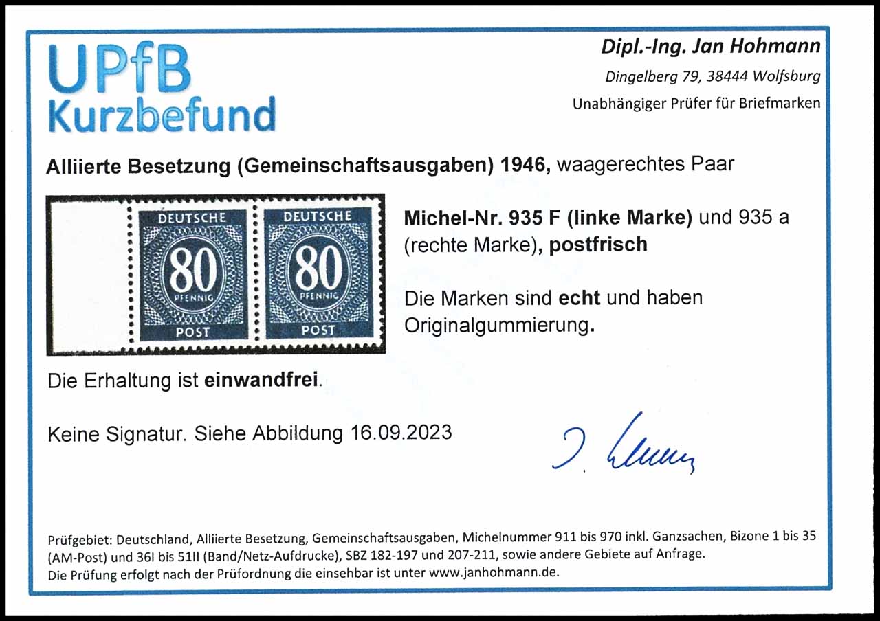 80 Pf Ziffer, linkes Randpaar, linke Marke in der Fehlfarbe schwärzlichviolettblau, nicht signiert, Fotobefund Hohmann UPfB:"...echt und einwandfrei", Mi 320.-