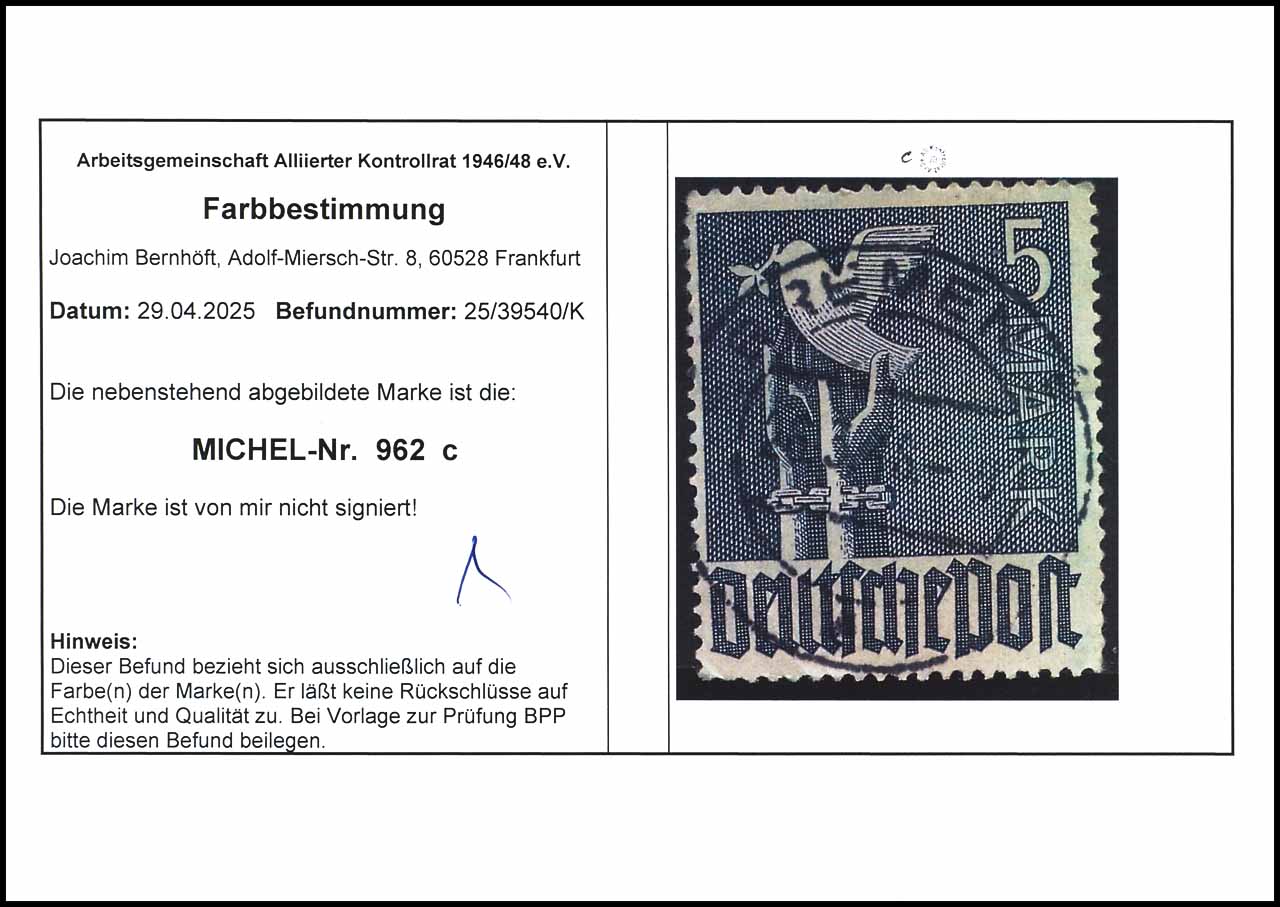 5 M Taube, c-Farbe, sauber gestempelt, Farbbefund Arge Kontrollrat Bernhöft, Mi 500.-