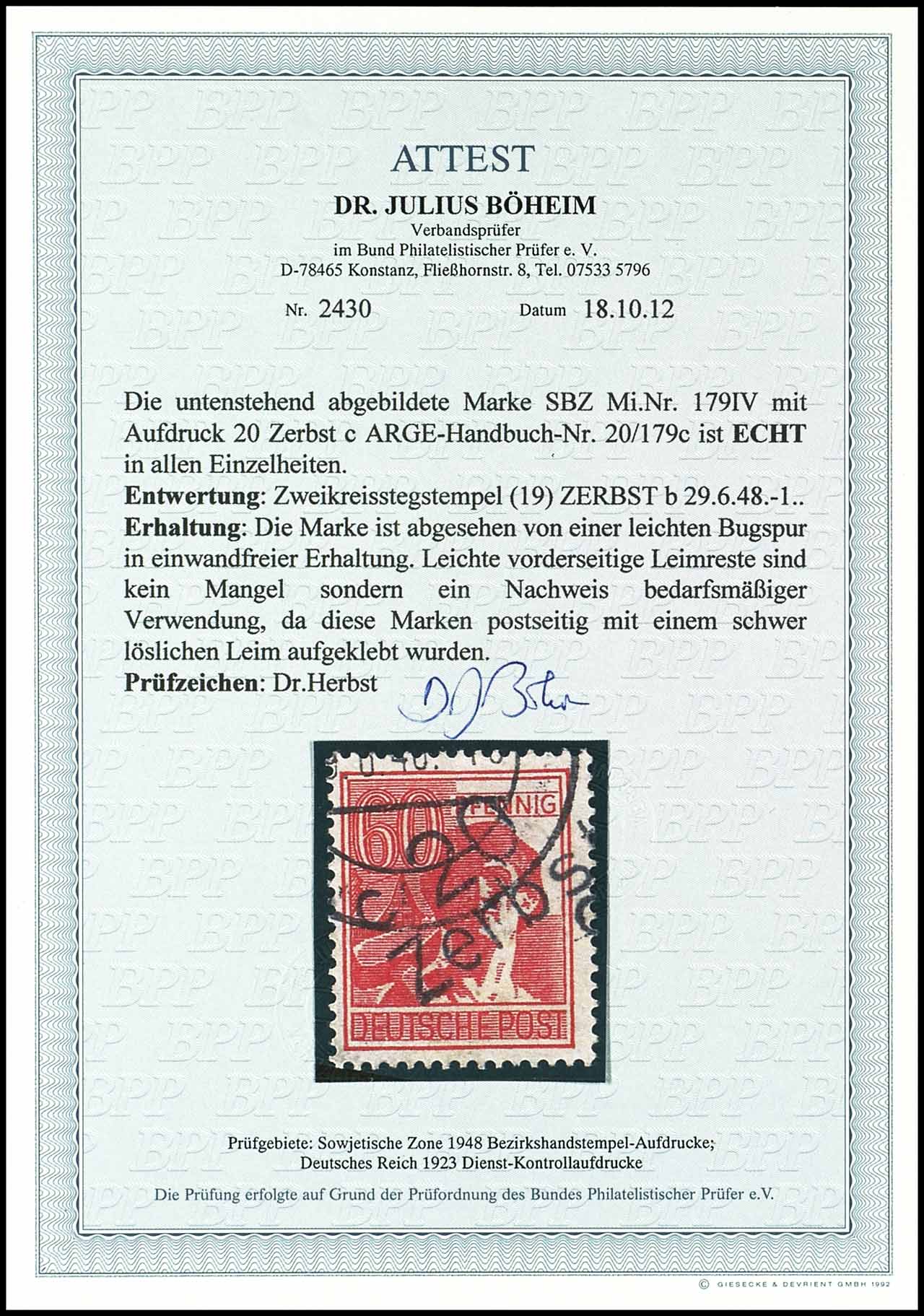 Helle 60 mit Aufdruck 20 Zerbst c, gestempelt, leichte Bugspur, Attest Böheim BPP, Mi. 450,-