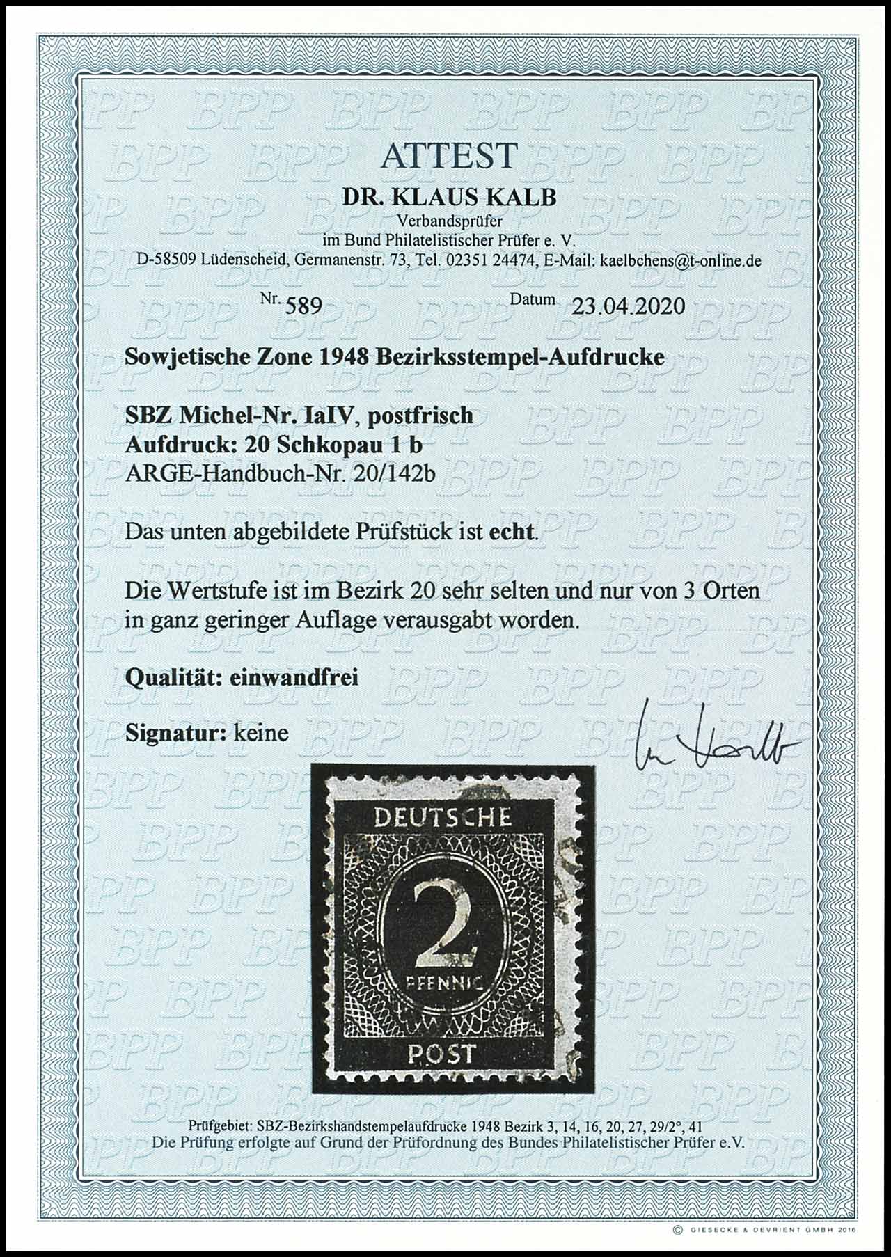 2 Pfennig Ziffer mit Aufdruck Schkopau 1 b, postfrisch, tadellose Erhaltung, sehr selten, Fotoattest Kalb BPP, Mi. 550,-