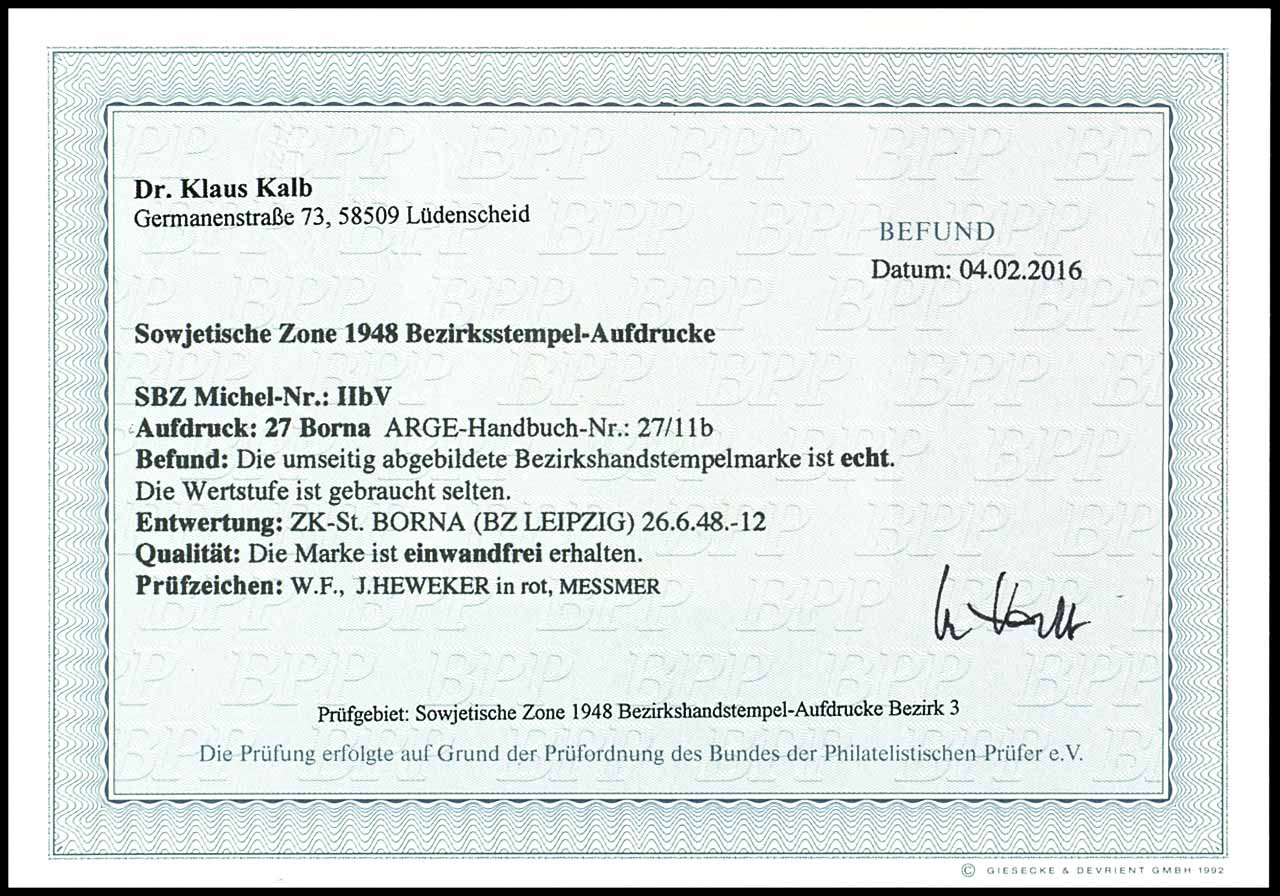 2 Mark mit Aufdruck 27 Borna, gestempelt, tadellose Erhaltung, Fotobefund Dr. Kalb BPP, Mi. 300,-