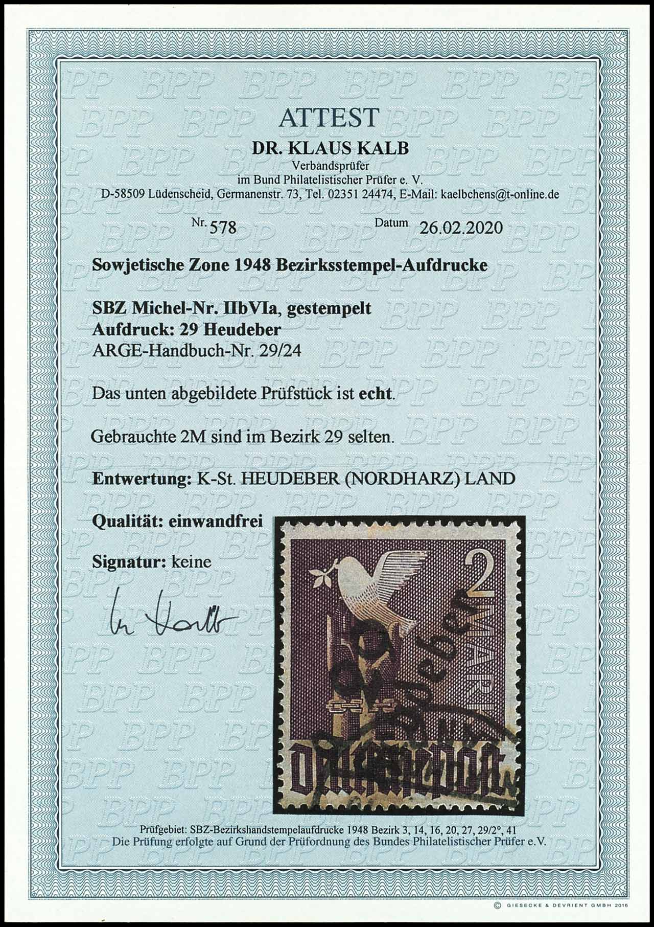 2 Mark mit Aufdruck 29 Heudeber, gestempelt, tadellose Erhaltung, Fotoattest Dr. Kalb BPP, Mi. 600,-