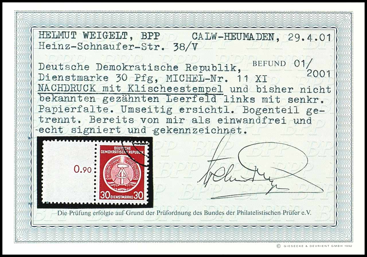 30 Pf. Dienstmarke mit anhängendem Leerfeld, Nachdruck mit Klischeestempel, Fotobefund Weigelt BPP "echt und einwandfrei", Mi. 150,-