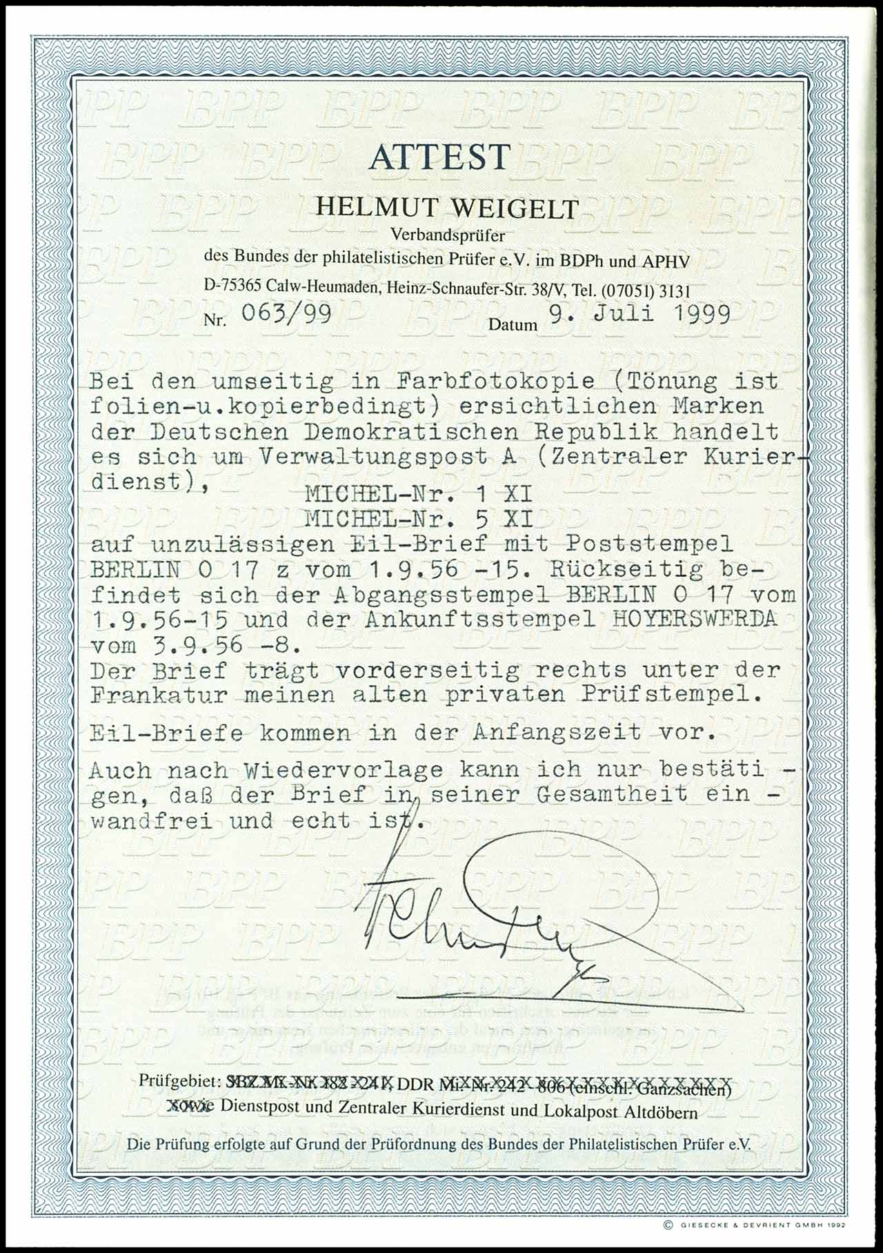 70 Pf. in Mischfrankatur mit 10 Pf. auf Eilbotenbrief von Berlin nach Hoyerswerda in tadellose Erhaltung, ein seltener Beleg aus der Anfangszeit des Zentralen Kurierdienstes, Fotoattest Weigelt BPP "echt und einwandfrei", Mi. 1000,- Euro