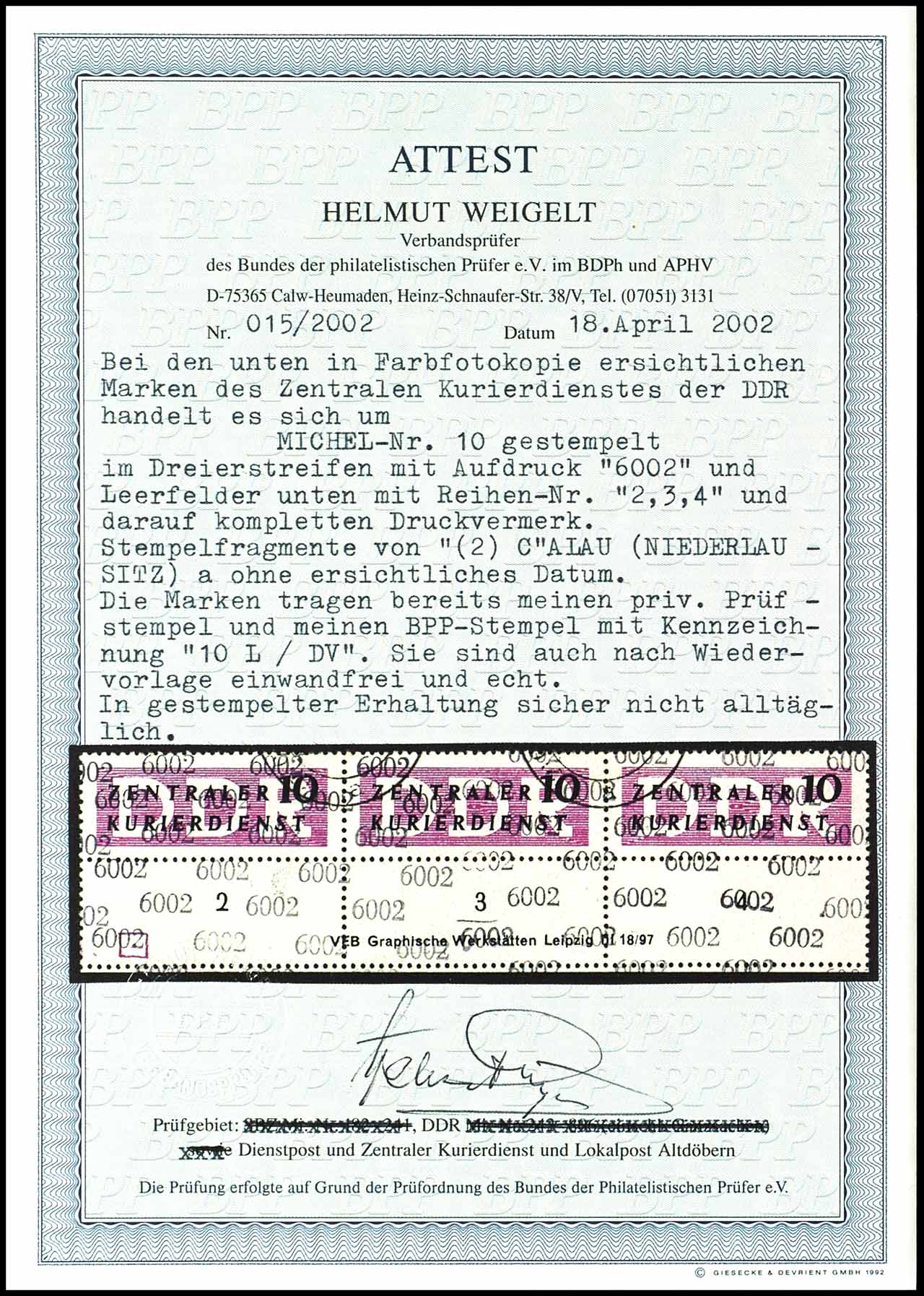 10 Pf. ZKD-Marken im 3er-Streifen mit Aufdruck "6002" je mit Leerfeld unten und kompletten Druckvermerk, tadellos, gestempelt, Fotoattest Weigelt BPP "echt und einwandfrei"