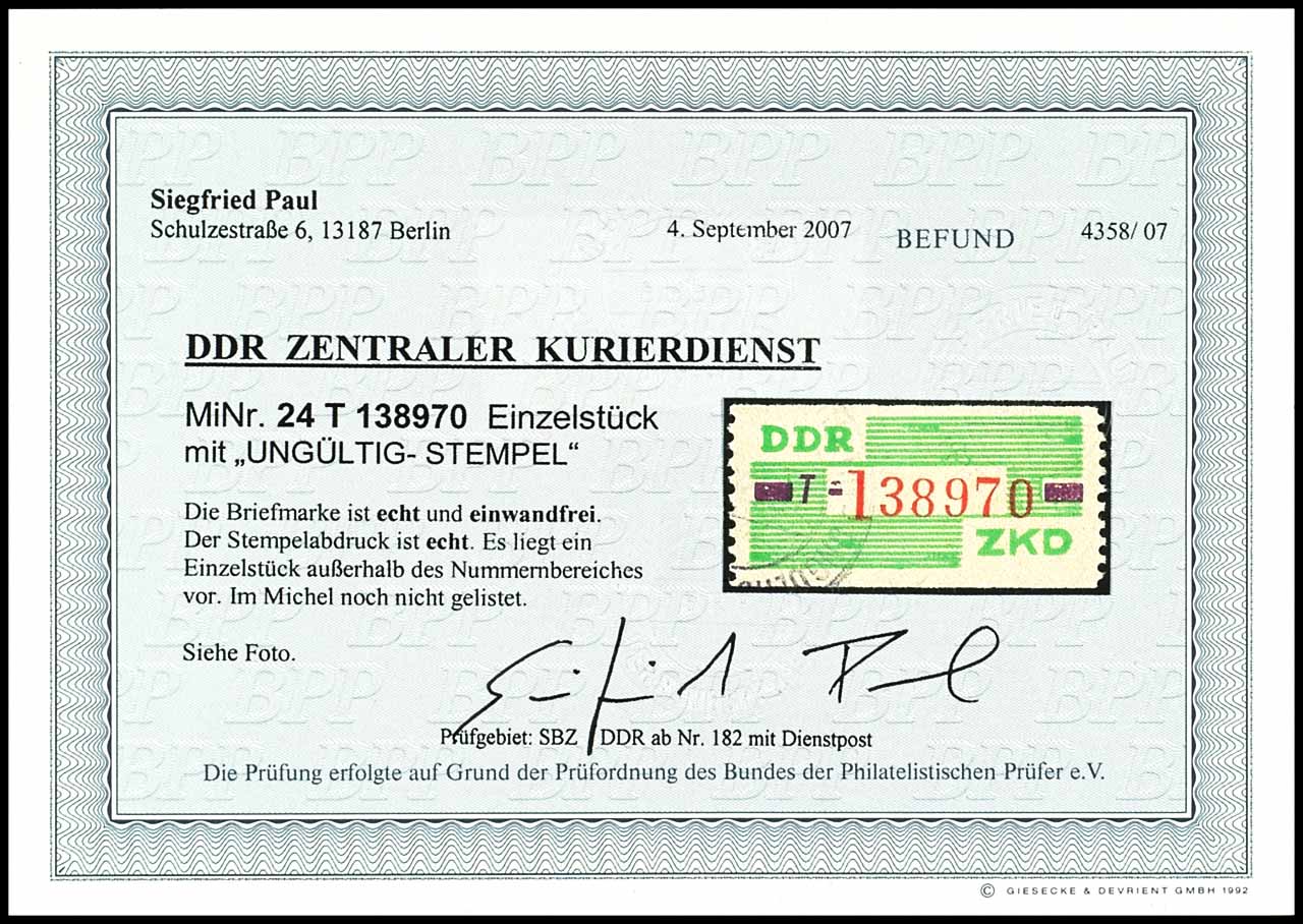 (10 Pf.) als Einzelstück mit lfd. Nr. "T 138970" außerhalb des normalen Nummernbereichs und mit ungültig-Stempel. Im Michel nur als Fußnote erwähnt, tadellos, Fotobefund Paul BPP (2007)