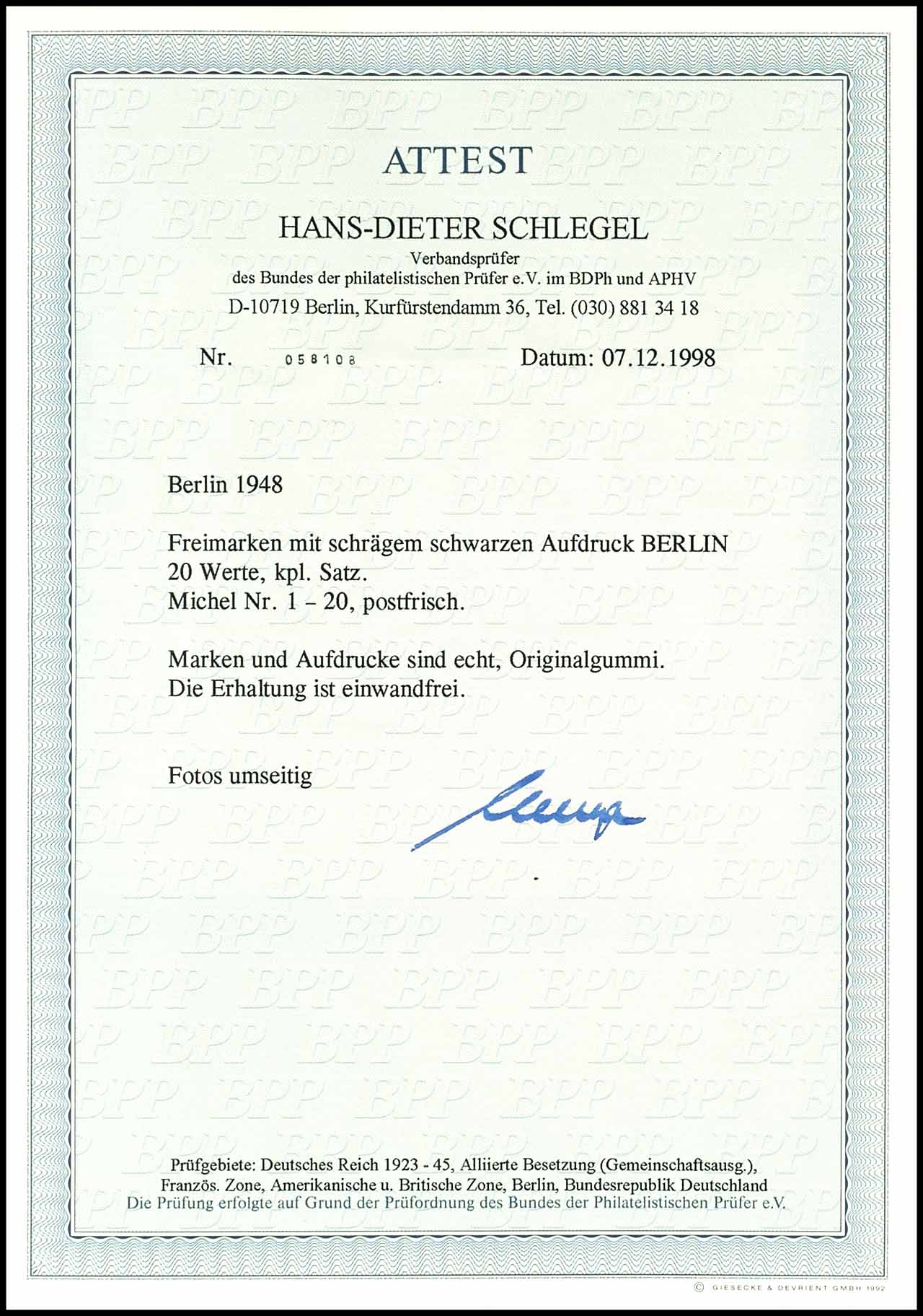 2 Pfennig bis 5 Mark Schwarzaufdruck, postfrisch, tadellose Erhaltung, dabei Ober- und Unterränder, Markwerte Unterrand Platte, Fotoattest Schlegel BPP, Mi. 1000,-