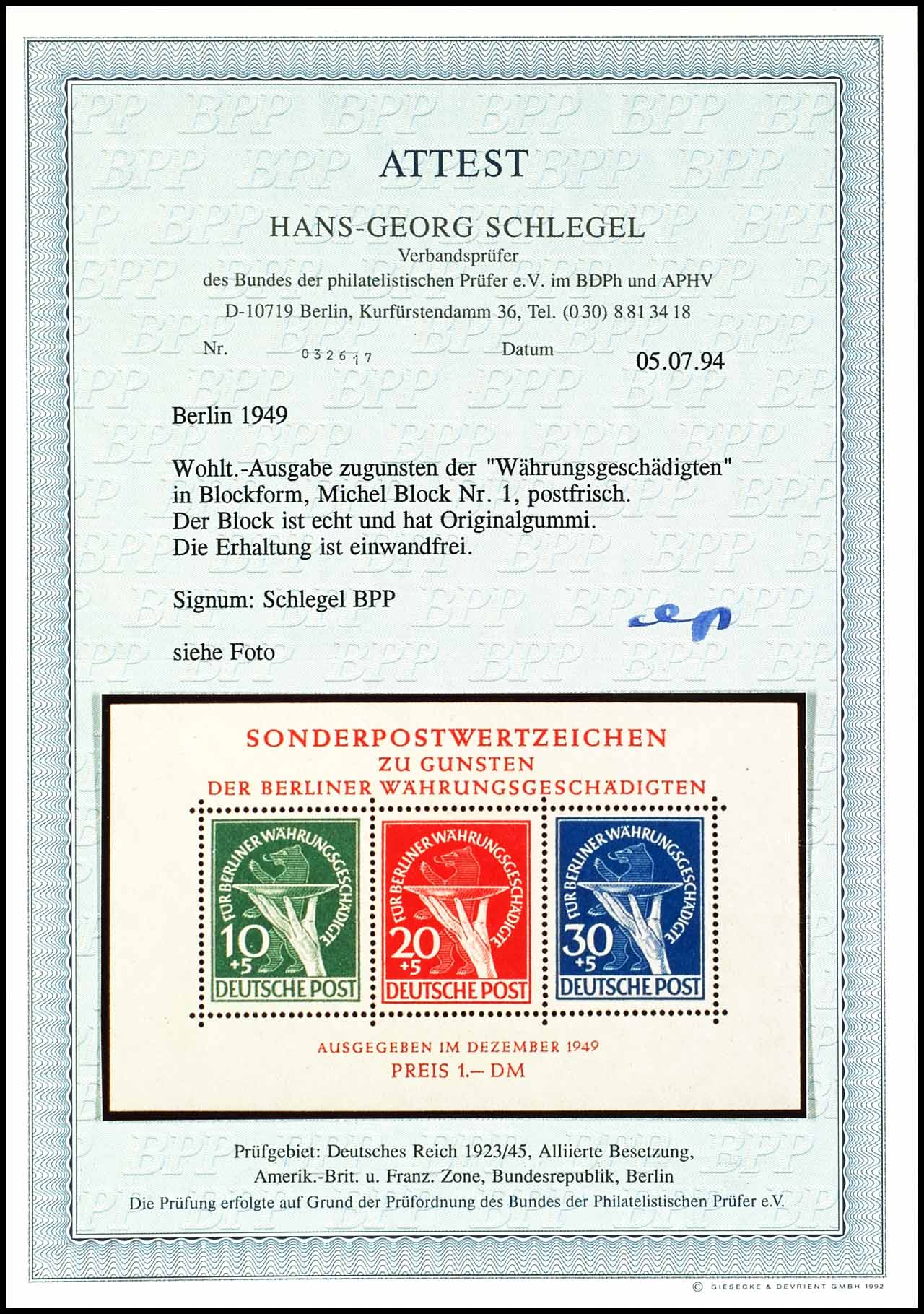 Block 1, postfrisch, tadellose Erhaltung, Fotoattest Schlegel BPP, Mi. 950,-