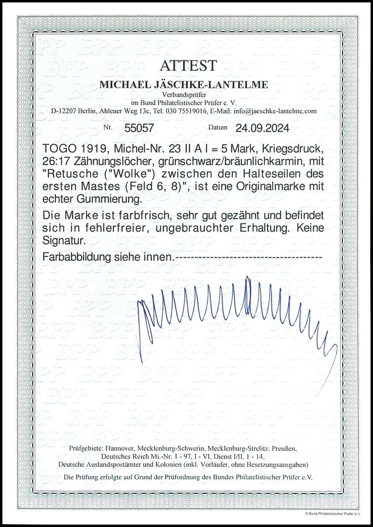 5 Mark Kaiseryacht, Plattenfehler I: "Retusche "Wolke" zwischen den Halteseilen des ersten Mastes (Feld6, 8, Teilauflage)", ungebraucht mit Originalgummierung, tadellose Erhaltung, unsigniert Fotoattest Michael Jäschke-Lantelme (2024), "in fehlerfreier ungebrauchter Erhaltung", Mi. 500.-