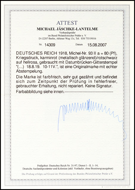 80 Pf. Germania Kriegsdruck, metallisch glänzend, tadellos gestempelt, Fotoattest Jäschke-Lantelme BPP: "farbfrisch, sehr gut gezähnt, in fehlerfreier, gebrauchter Erhaltung.", Mi. 1800,--