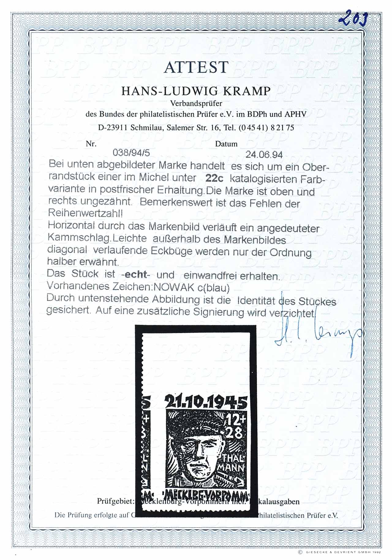 12 + 28 Pfg Opfer des Faschismus in der sehr seltenen c-Farbe dunkelrot, vom oberen Bogenrand, oben und rechts ungezähnt, postfrisch, mit Fotoattest Kramp BPP: "echt und einwandfrei". Eine seltene Variante, so im Michelkatalog nicht verzeichnet.