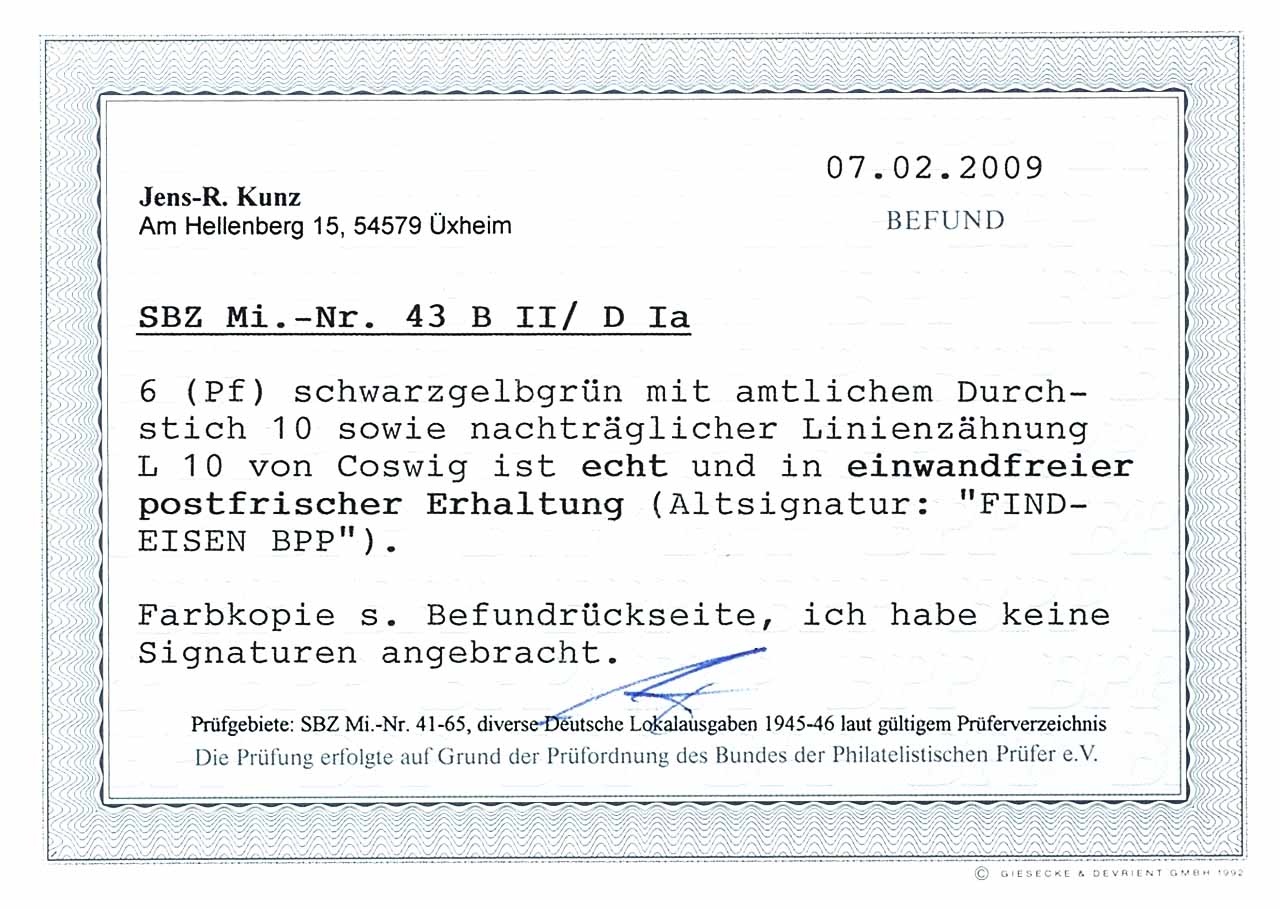 6 Pfg Ziffern mit amtlichen Durchstich 10 sowie nachträglicher Linienzähnung L10 von Coswig, tadellos postfrisch, Fotobefund Kunz BPP: "echt und in einwandfreier postfrischer Erhaltung.", Mi. 900.-