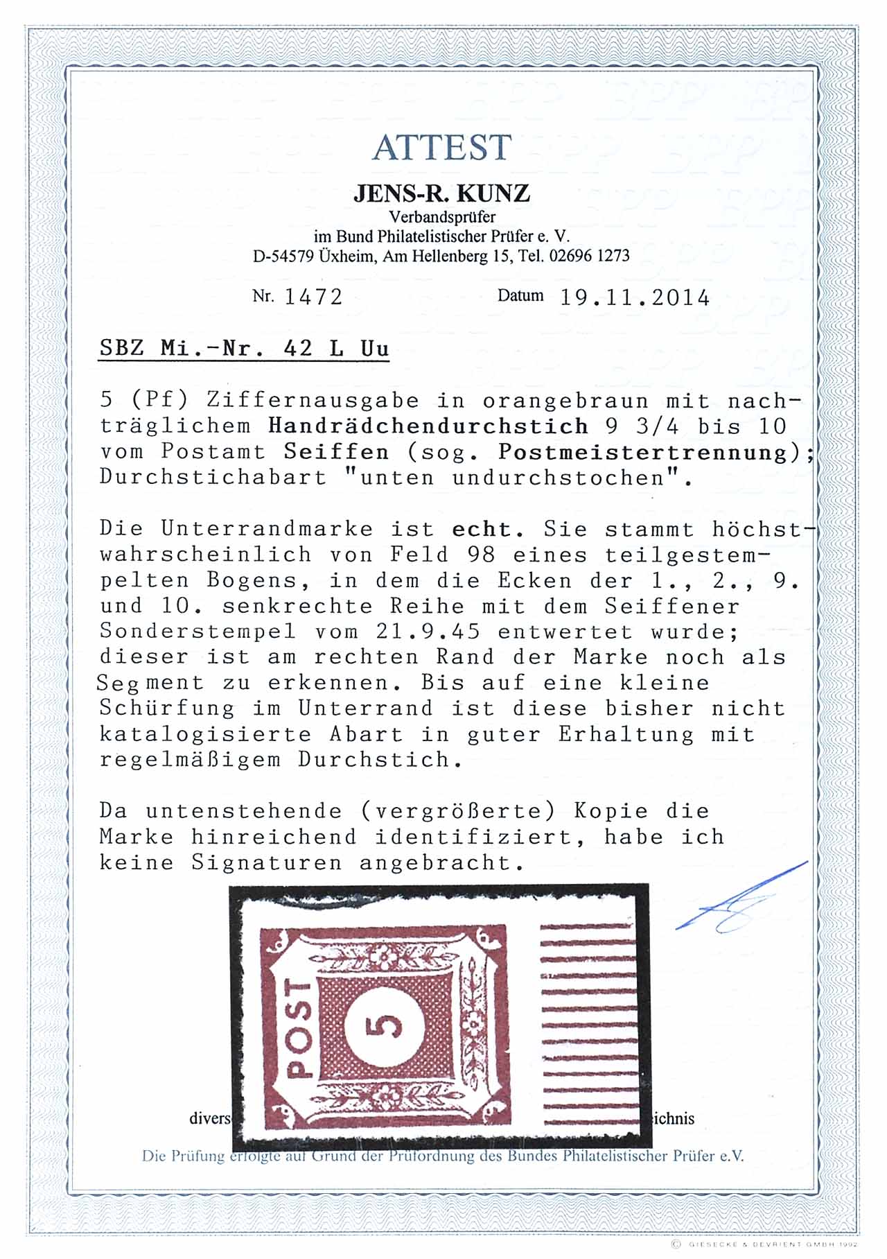 5 Pfg Ziffern mit Handrädchendurchstich 9 3/4 bis 10 vom Postamt Seiffen (sog. Postmeistertrennung), Abart "unten undurchstochen), vermutlich von Feld 98 stammendes Unterrandstück mit Segment des Sonderstempels (von Bogenentwertung) - die vier Ecken des Bogens wurden mit Sonderstempel entwertet, im Unterrand kl. Schürfung sonst in guter Erhaltung, Fotoattest Kunz BPP, Mi. 2.000.-