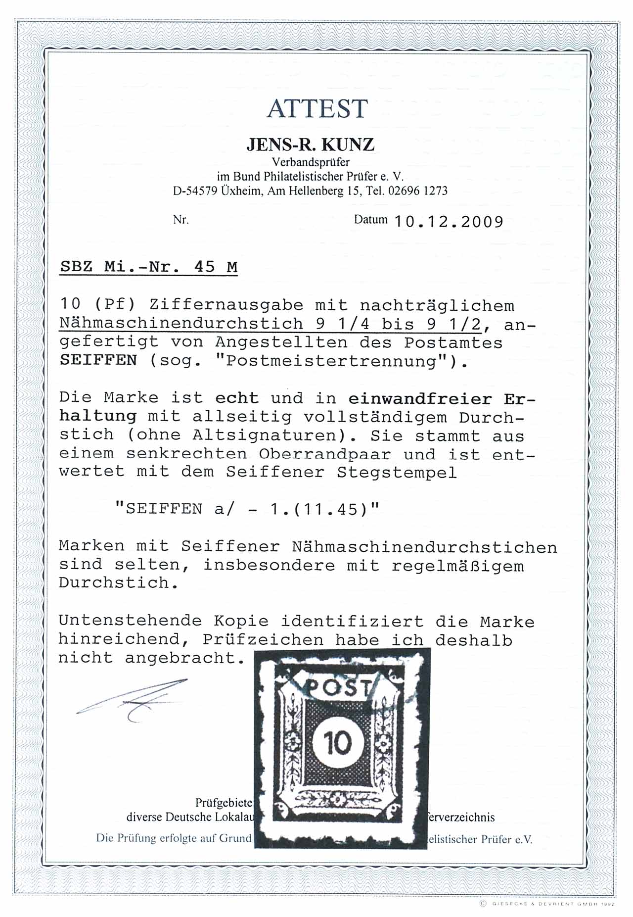 10 Pfg Ziffern Nähmaschinen-Durchstich 9 1/4 bis 9 1/2 von Seiffen sog. Postmeistertrennung, tadellos gestempelt "Seiffen a/ -1.(11.45)", Fotoattest Kunz BPP: "echt und einwandfrei", Mi. 1.600.-