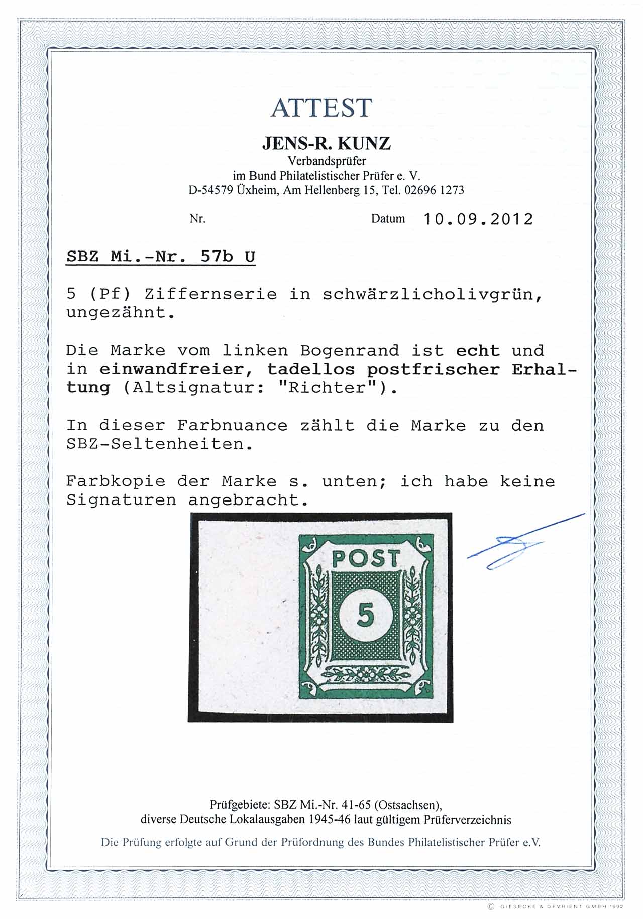 5 Pfg Ziffern schwärzlicholivgrün, Abart "ungezähnt", tadellos postfrisch, Fotoattest Kunz BPP: "echt und einwandfrei. ...In dieser Farbnuance zählt die Marke zu den SBZ-Seltenheiten.", Mi. 900.-